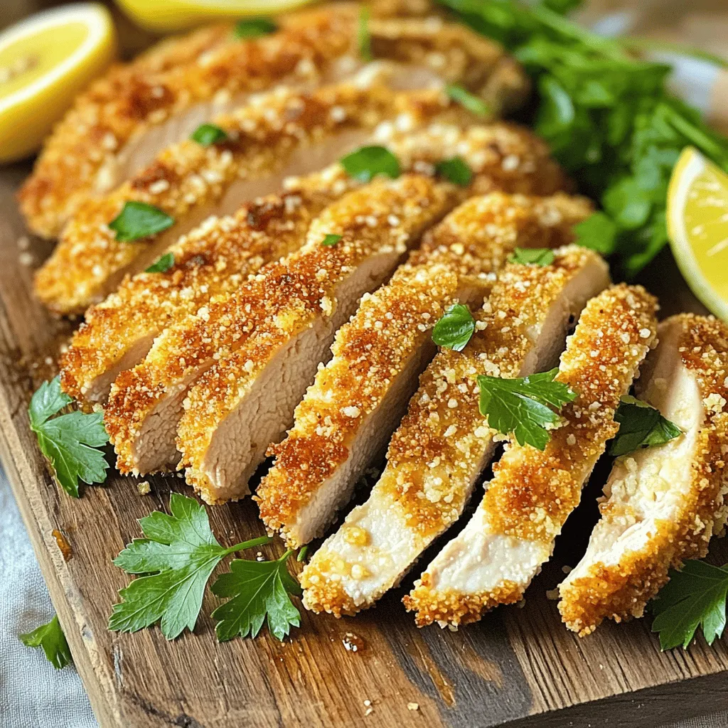 Die Hauptzutaten sind einfach und lecker. Die Hähnchenbrustfilets geben dir eine saftige Basis. Parmesan sorgt für einen tollen Geschmack, während Panko-Semmelbrösel die Knusprigkeit bringen.