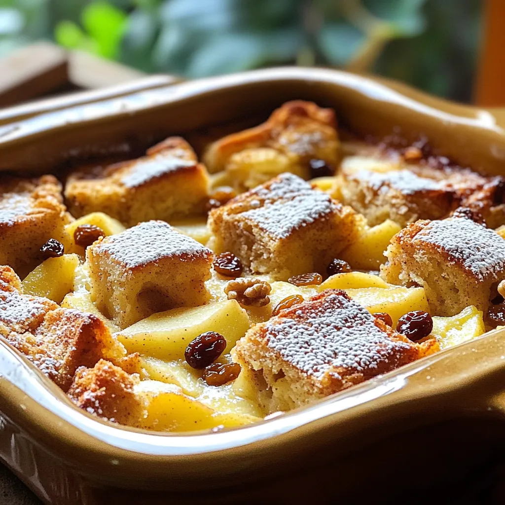 Lass die Mischung etwa 15 Minuten ruhen. So kann das Brot die Flüssigkeit aufnehmen. Backe den Pudding im Ofen für 40-45 Minuten. Er ist fertig, wenn die Oberseite goldbraun ist und ein Messer sauber herauskommt. Nimm das Gericht aus dem Ofen und lasse es einige Minuten abkühlen. Optional kannst du es mit Puderzucker bestäuben, bevor du es servierst.