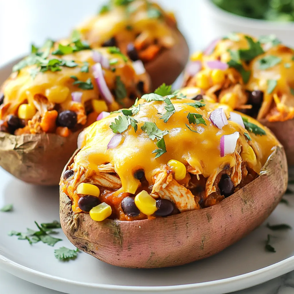 Eine köstliche Kombination aus zarten Süßkartoffeln, gefüllt mit BBQ-Hähnchen und Käse.