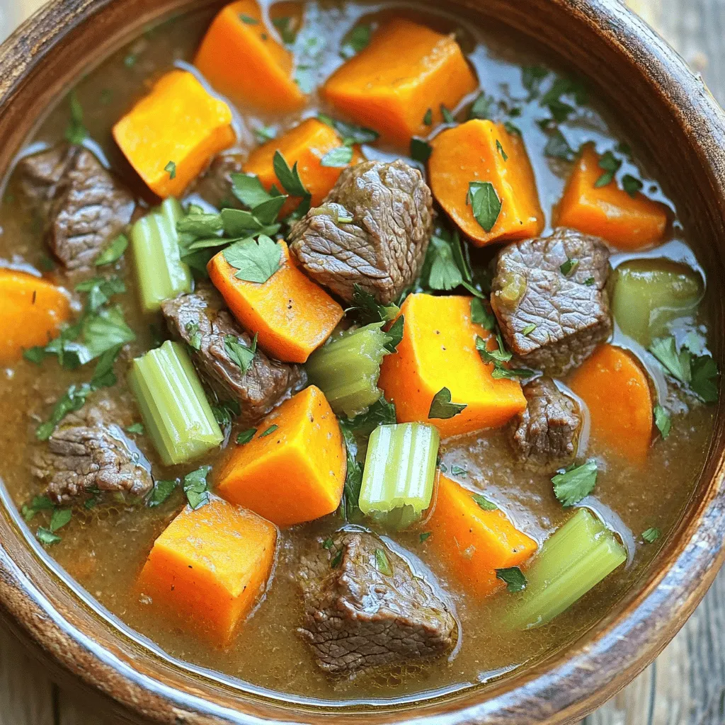 - 900 g Rinderbrust, in 2,5 cm große Würfel geschnitten - 2 mittelgroße Süßkartoffeln, geschält und gewürfelt - 1 große Zwiebel, grob gehackt - 3 Knoblauchzehen, fein gehackt - 3 Karotten, in Scheiben geschnitten - 2 Stangen Sellerie, gewürfelt Die Hauptzutaten bilden die Basis für unseren Eintopf. Rinderbrust gibt einen tiefen, herzhaften Geschmack. Süßkartoffeln sorgen für eine süße Note und eine cremige Textur. Zwiebeln und Knoblauch bringen Aromen, die die anderen Zutaten ergänzen. Karotten und Sellerie fügen Frische und Crunch hinzu. - 1 Liter Rinderbrühe - 1 Esslöffel Tomatenmark - 1 Teelöffel getrockneter Thymian - 1 Teelöffel geräuchertes Paprikapulver - Salz und Pfeffer nach Geschmack Die Flüssigkeiten sind wichtig für den Eintopf. Rinderbrühe gibt Tiefe. Tomatenmark sorgt für Farbe und Geschmack. Gewürze wie Thymian und Paprikapulver bringen zusätzliche Aromen. Salz und Pfeffer helfen, alles zu balancieren. - 2 Esslöffel Olivenöl - Frische Petersilie zur Garnitur Olivenöl hilft beim Anbraten des Fleisches. Es gibt auch ein wenig Fett, das die Aromen verbindet. Frische Petersilie ist eine schöne Garnierung. Sie bringt Farbe und Frische in das Gericht. - Zuerst nehme ich 900 g Rinderbrust. Ich schneide sie in 2,5 cm große Würfel. - Dann würze ich das Fleisch mit Salz und Pfeffer. - In einer großen Pfanne erhitze ich 2 Esslöffel Olivenöl bei mittlerer bis hoher Hitze. - Ich brate die Rindfleischwürfel in Chargen. Jedes Stück brate ich etwa 5 Minuten, bis es schön braun ist. - Nach dem Anbraten nehme ich das Fleisch aus der Pfanne und stelle es beiseite. - Im gleichen Pfannenboden gebe ich die grob gehackte Zwiebel und den fein gehackten Knoblauch. - Ich brate sie 2-3 Minuten, bis die Zwiebel glasig ist. - Während das brät, schäle und würfle ich 2 mittelgroße Süßkartoffeln. - Ich schneide 3 Karotten in Scheiben und würfle 2 Stangen Sellerie. - Jetzt gebe ich die angebratenen Rindfleischwürfel, die Zwiebel und den Knoblauch in den Slow Cooker. - Dazu kommen die gewürfelten Süßkartoffeln, Karotten und Sellerie. - Ich gieße 1 Liter Rinderbrühe über alles und füge 1 Esslöffel Tomatenmark, 1 Teelöffel getrockneten Thymian und 1 Teelöffel geräuchertes Paprikapulver hinzu. - Ich rühre alles gut um, damit sich die Aromen verbinden. - Dann decke ich den Slow Cooker ab. Ich stelle ihn auf niedriger Stufe für 8 Stunden oder auf hoher Stufe für 4 Stunden ein. - Nach der Kochzeit ist das Fleisch zart und das Gemüse durchgegart. - Niedrige vs. hohe Einstellung: - Beim langsamen Kochen nutzt du die niedrige Stufe für zartes Fleisch. Sie gibt dem Rindfleisch Zeit, weich zu werden. Die hohe Stufe kocht schneller, kann aber das Fleisch zäh machen. Wähle also die niedrige Stufe für beste Ergebnisse. - Zartes Fleisch erreichen: - Um zartes Fleisch zu haben, lasse es mindestens 8 Stunden auf niedriger Stufe kochen. Dadurch werden die Aromen intensiv. - Verwendung von frischen Kräutern: - Frische Kräuter bringen den Eintopf zum Leben. Füge einige Zweige frischen Thymian oder Rosmarin kurz vor dem Servieren hinzu. Das hebt den Geschmack enorm. - Anpassung der Gewürze: - Probiere, die Gewürze nach deinem Geschmack anzupassen. Vielleicht magst du mehr Paprika für einen rauchigen Geschmack oder etwas Chili für Schärfe. - Servierideen und Beilagen: - Dieser Eintopf passt gut zu frischem Brot oder einem grünen Salat. Das Brot kann die leckere Brühe aufnehmen. - Garnierung mit Petersilie: - Petersilie gibt nicht nur Farbe, sondern auch Frische. Streue sie über den Eintopf, bevor du servierst. So sieht das Gericht noch appetitlicher aus. {{image_4}} Für Ihren Beef & Sweet Potato Stew können Sie andere Gemüse verwenden. Kürbis passt hervorragend. Er hat einen süßen Geschmack und eine tolle Textur. Kartoffeln sind ebenfalls eine gute Wahl. Sie machen das Gericht noch herzhafter. Fügen Sie auch grünen Bohnen oder Erbsen hinzu. Diese Gemüse bringen Farbe und zusätzliche Nährstoffe. Wenn Sie eine andere Proteinquelle möchten, probieren Sie Pute. Sie hat einen milderen Geschmack und wird zart. Auch Schweinefleisch funktioniert gut. Die Konsistenz bleibt ähnlich. Für eine vegetarische Variante können Sie Kichererbsen oder Linsen verwenden. Diese geben dem Eintopf einen tollen Biss und viel Protein. Fügen Sie asiatische Gewürze hinzu, um einen neuen Geschmack zu erleben. Ingwer und Sojasauce können das Gericht aufpeppen. Mediterrane Aromen wie Oregano oder Rosmarin bringen einen anderen Flair. Sie können auch Feta-Käse darüber streuen. Das gibt dem Eintopf eine frische Note und macht ihn besonders. Um deinen Rindfleisch- und Süßkartoffeleintopf frisch zu halten, gibt es einige einfache Tipps. Lass den Eintopf zuerst abkühlen, bevor du ihn lagerst. Du kannst ihn in einem luftdichten Behälter im Kühlschrank aufbewahren. Hier sind die Details: - Kühlen und Einfrieren: Der Eintopf kann im Kühlschrank bis zu 4 Tage halten. Für längere Lagerung kannst du ihn auch einfrieren. Achte darauf, ihn in Portionen zu teilen, damit du nur das benötigte aufwärmst. Freeze it in einem gefrierfesten Behälter oder Beutel. - Haltbarkeit im Kühlschrank: Er ist nach dem Kochen bis zu 4 Tage im Kühlschrank sicher. Das ist perfekt, wenn du ein schnelles Abendessen brauchst. Wenn es Zeit ist, den Eintopf wieder aufzuwärmen, gibt es einige gute Methoden. Ich empfehle, den Eintopf sanft zu erhitzen, um den Geschmack zu bewahren. - Beste Methoden zum Aufwärmen: Du kannst den Eintopf auf dem Herd bei mittlerer Hitze aufwärmen. Rühre regelmäßig um, damit er gleichmäßig heiß wird. Du kannst auch die Mikrowelle nutzen, aber achte darauf, ihn in kurzen Intervallen zu erhitzen. - Tipps für Mikrowelle oder Herd: Wenn du die Mikrowelle benutzt, decke den Behälter ab, um Spritzer zu vermeiden. Erhitze in 1-Minuten-Intervallen und rühre dazwischen um. Wenn du nach neuen Ideen suchst, wie du die Reste deines Eintopfs nutzen kannst, ha