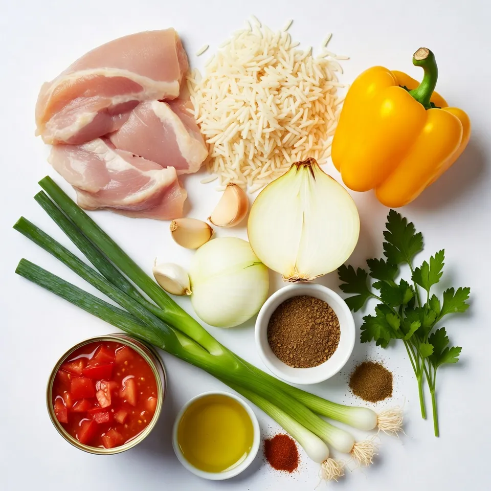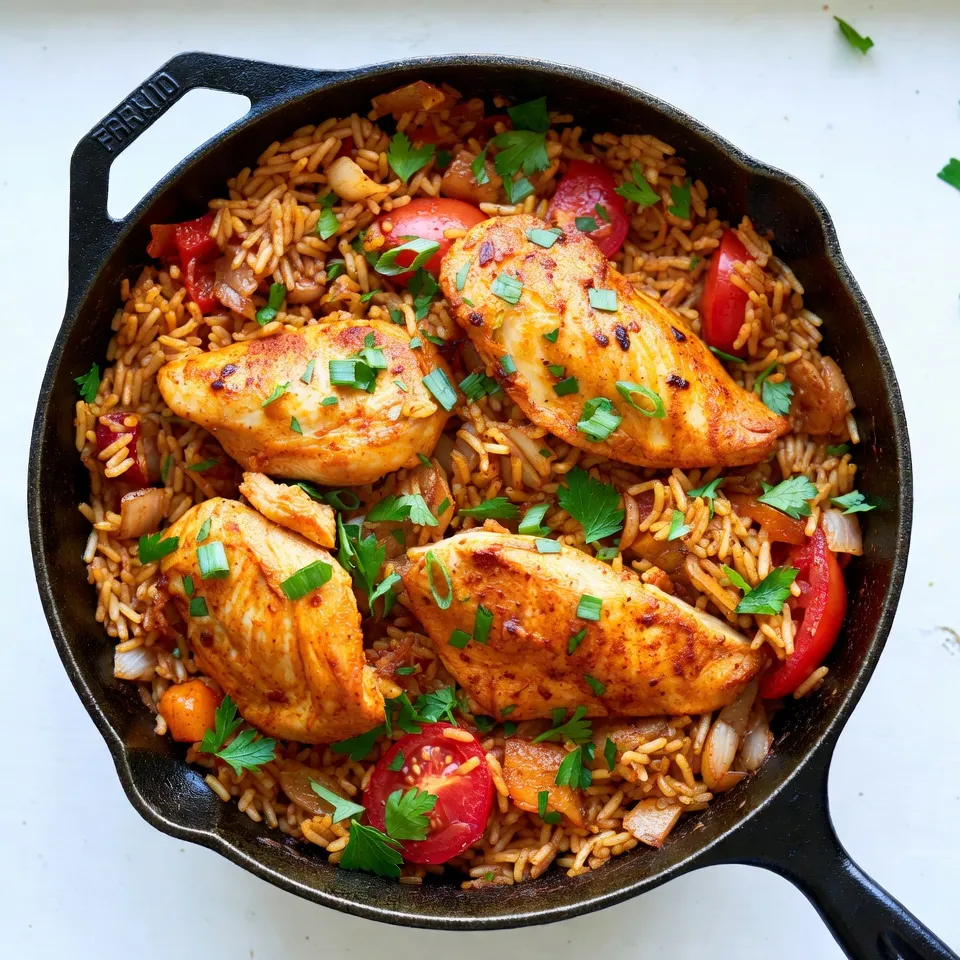 Ein würziges und herzhaftes Gericht mit Hähnchen, Reis und Gemüse, perfekt für ein schnelles Abendessen.