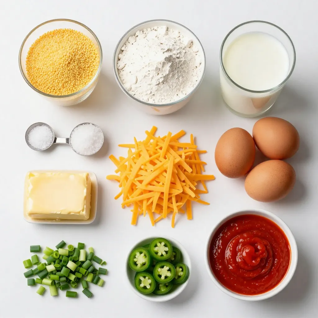 Diese Zutaten machen die Käse-Chili-Maisbrot-Tassen so lecker. Maismehl gibt eine tolle Textur. Weizenmehl sorgt für Stabilität. Backpulver macht die Tassen schön fluffig. Salz hebt die Aromen hervor. Milch und Eier halten alles zusammen.