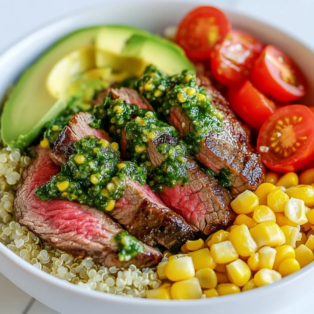 Schüssel Zusammenstellen: In Servier-Schalen zunächst eine Basis aus Quinoa anrichten. Darauf die geschnittenen Steaks, Kirschtomaten, Avocadoscheiben, Mais, rote Paprika und eine großzügige Menge Chimichurri-Sauce geben.