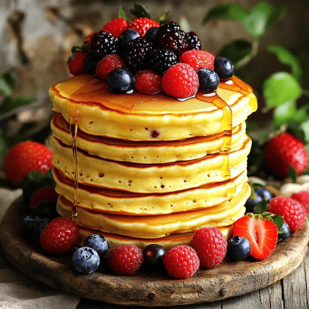 Servieren Sie die Pancakes warm. Garnieren Sie sie mit den zurückbehaltenen Beeren und einem Spritzer Honig oder Ahornsirup.