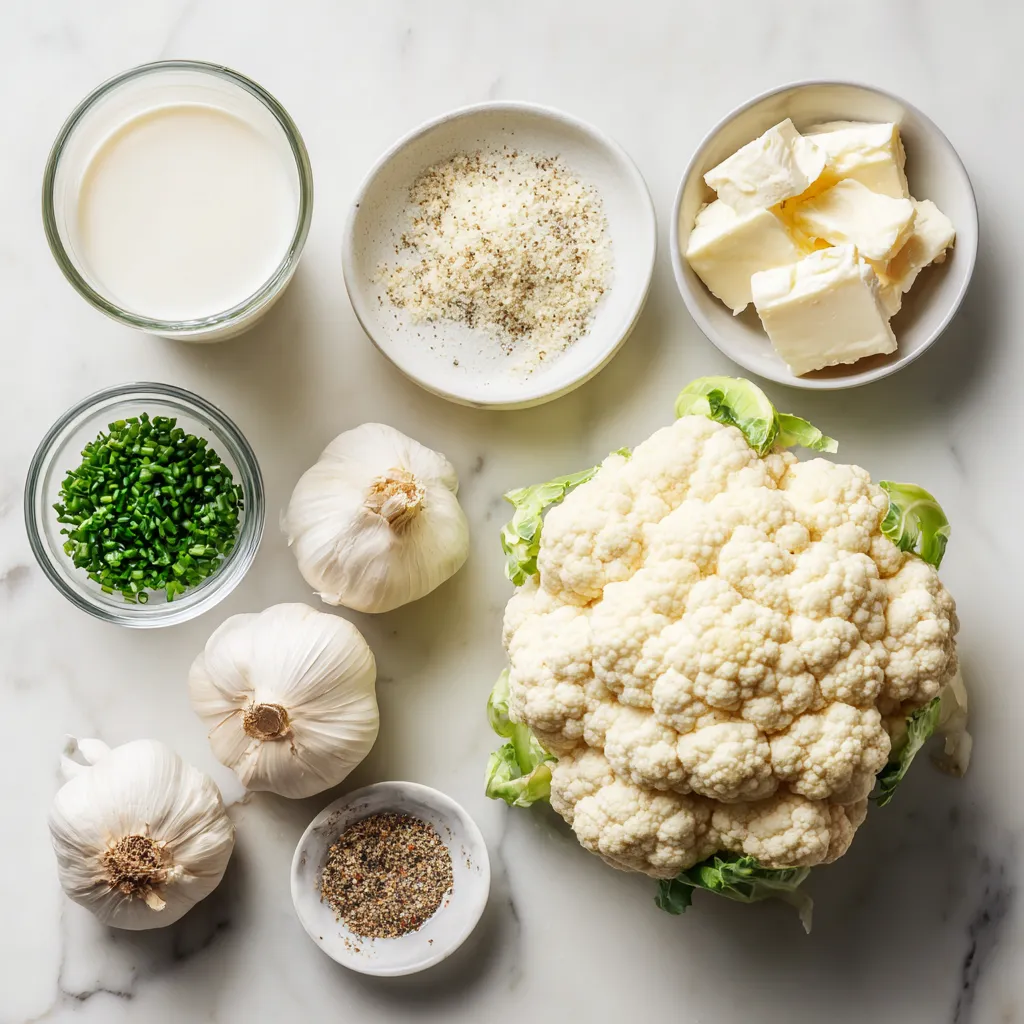 Die Basis für unser Püree ist der Blumenkohl. Er hat einen milden Geschmack und eine tolle Textur. Der Knoblauch bringt einen herzhaften Geschmack. Das Olivenöl sorgt für einen guten Geschmack und hilft beim Rösten. Der Frischkäse macht das Püree cremig und reichhaltig.