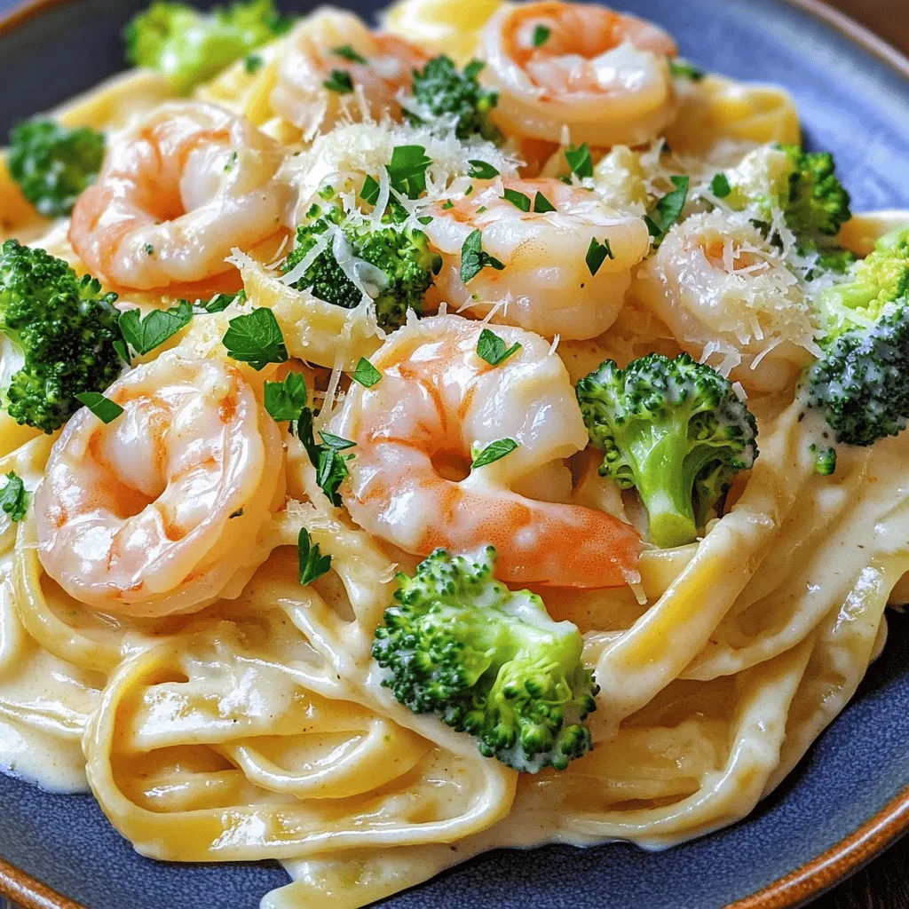 Kombinieren: Geben Sie die Garnelen zurück in die Pfanne, zusammen mit den gekochten Fettuccine und dem Brokkoli. Vorsichtig umrühren, damit alles gleichmäßig mit der cremigen Sauce überzogen ist. Mit Salz und Pfeffer abschmecken.