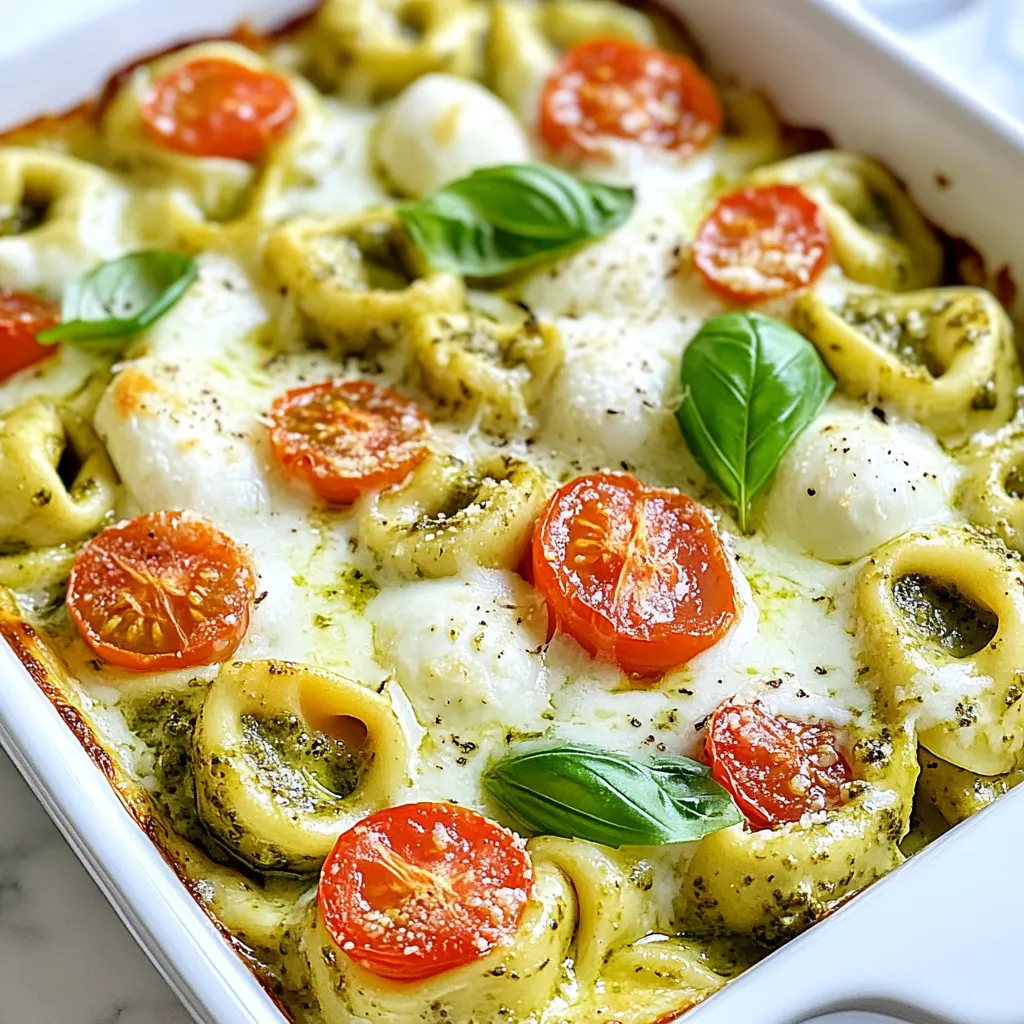Ein köstlicher Auflauf mit Käse-Tortellini, Pesto und frischen Tomaten.