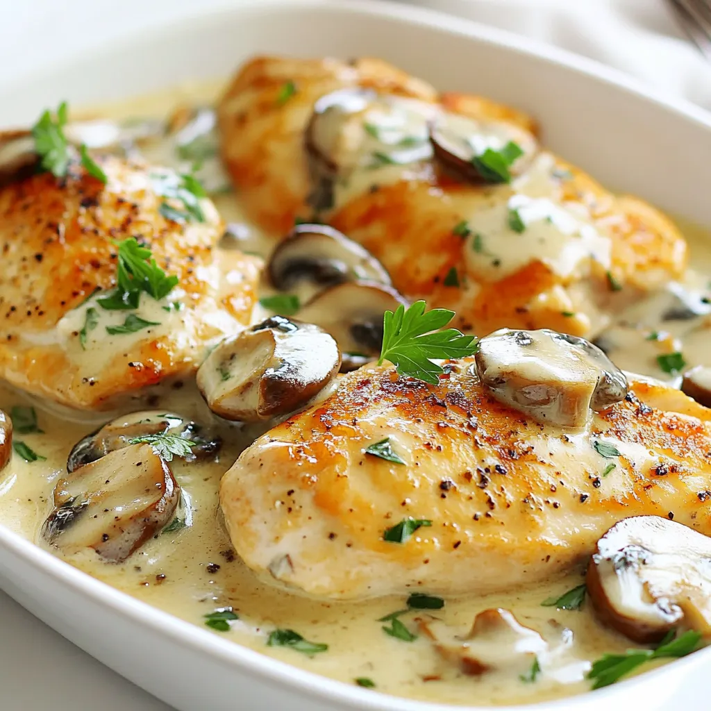Servieren Sie das cremige Pilz-Hühnchen auf einem Bett aus fluffigen Kartoffelbrei oder mit einer Beilage von gedämpftem Gemüse.