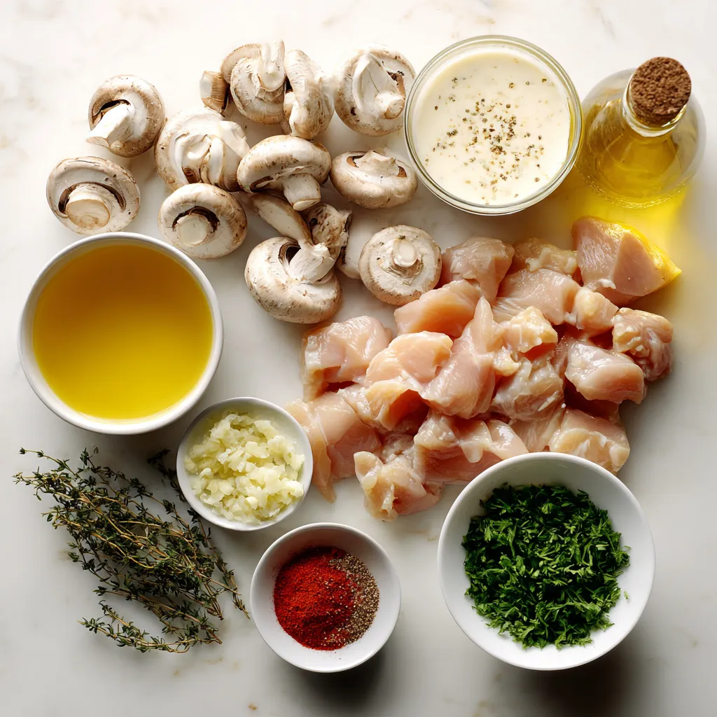 Die Hauptzutaten bilden die Basis für unser Gericht. Hähnchenbrüste sind zart und saftig. Sie geben dem Gericht Protein und Fülle. Geschnittene Pilze sorgen für einen herzhaften Geschmack. Ich bevorzuge Cremini-Pilze, aber Champignons passen auch gut. Schlagsahne macht die Sauce reichhaltig und cremig. Hühnerbrühe fügt Tiefe und Geschmack hinzu.