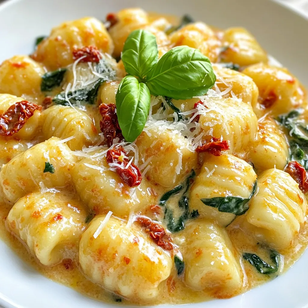 Ein köstliches und cremiges Gericht mit Gnocchi, getrockneten Tomaten und frischem Spinat.