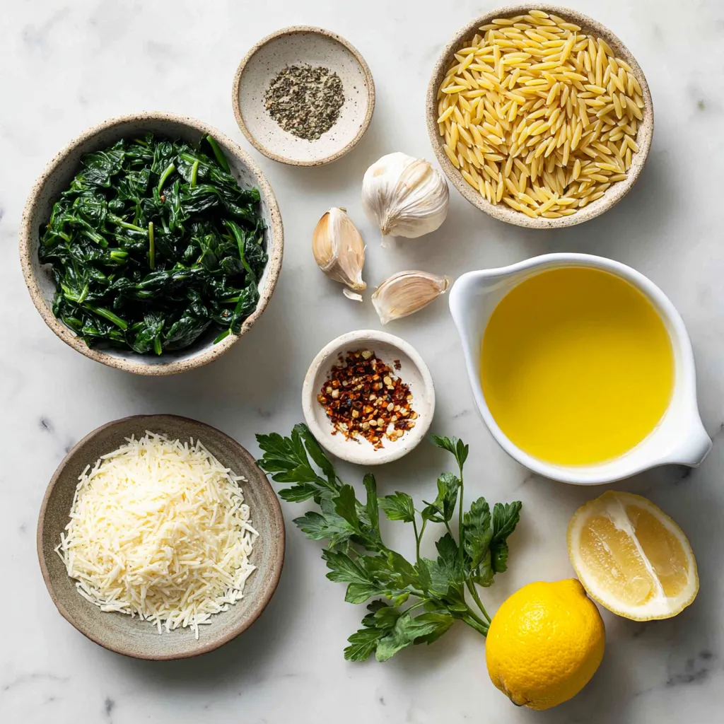 Jede Zutat bringt ihren eigenen Geschmack. Der Orzo macht das Gericht herzhaft. Frischer Spinat sorgt für Farbe und gute Nährstoffe. Knoblauch gibt das tolle Aroma. Schlagsahne macht es cremig und reichhaltig. Gemüsebrühe fügt Tiefe hinzu. Olivenöl bringt Geschmack und hilft beim Anbraten. Parmesan sorgt für Umami. Die Gewürze runden alles ab.