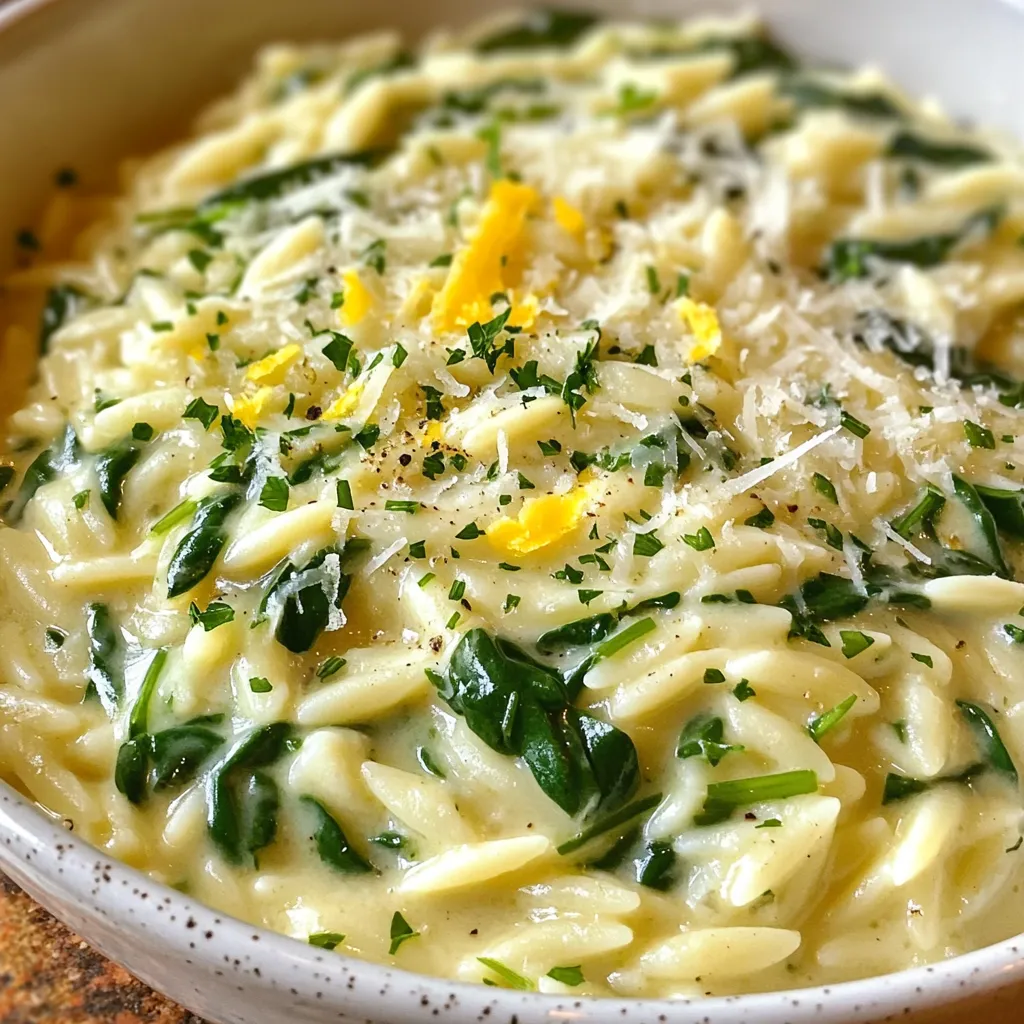 Ein cremiges und schmackhaftes Gericht mit Orzo, frischem Spinat und Knoblauch.