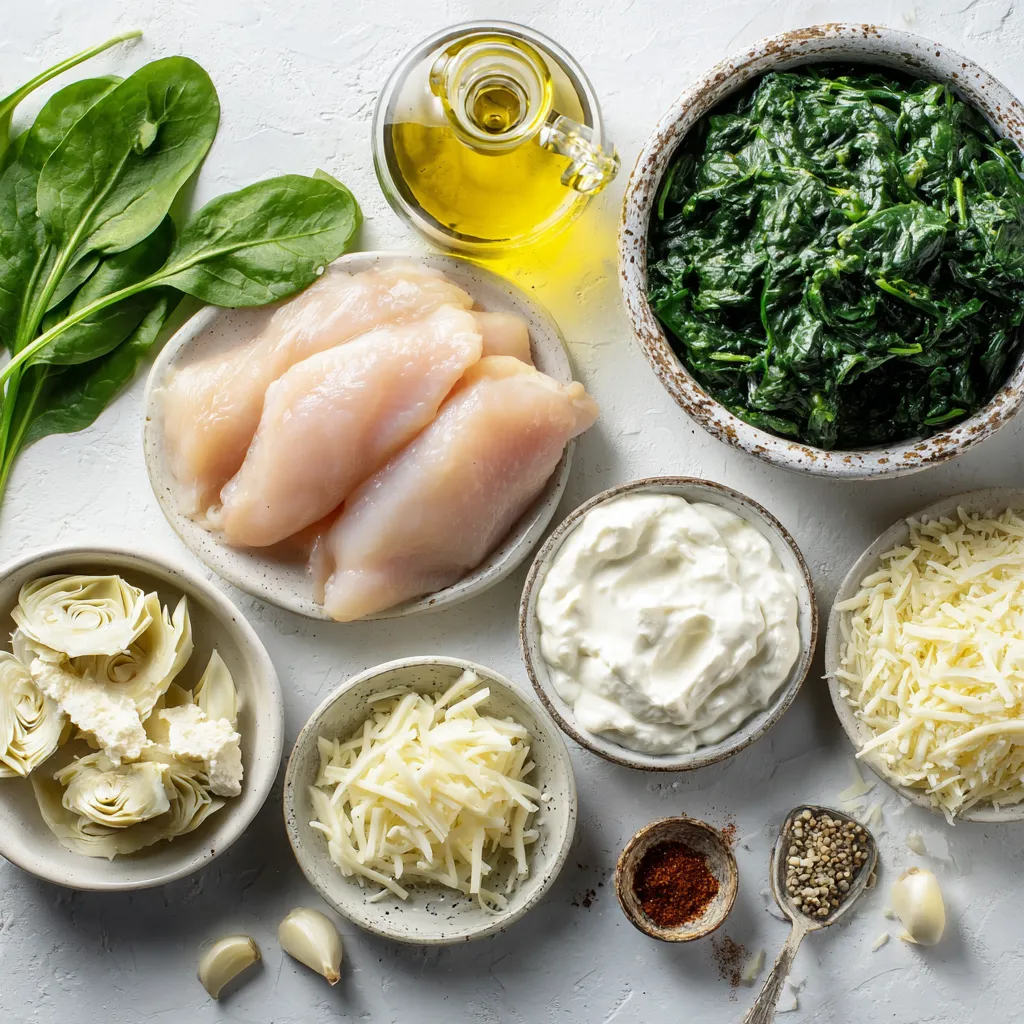 Hauptzutaten für cremiges Spinat-Artischocken-Hühnchen