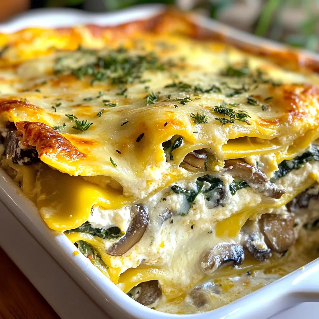 Eine köstliche Lasagne mit einer cremigen Pilzfüllung und viel Käse.