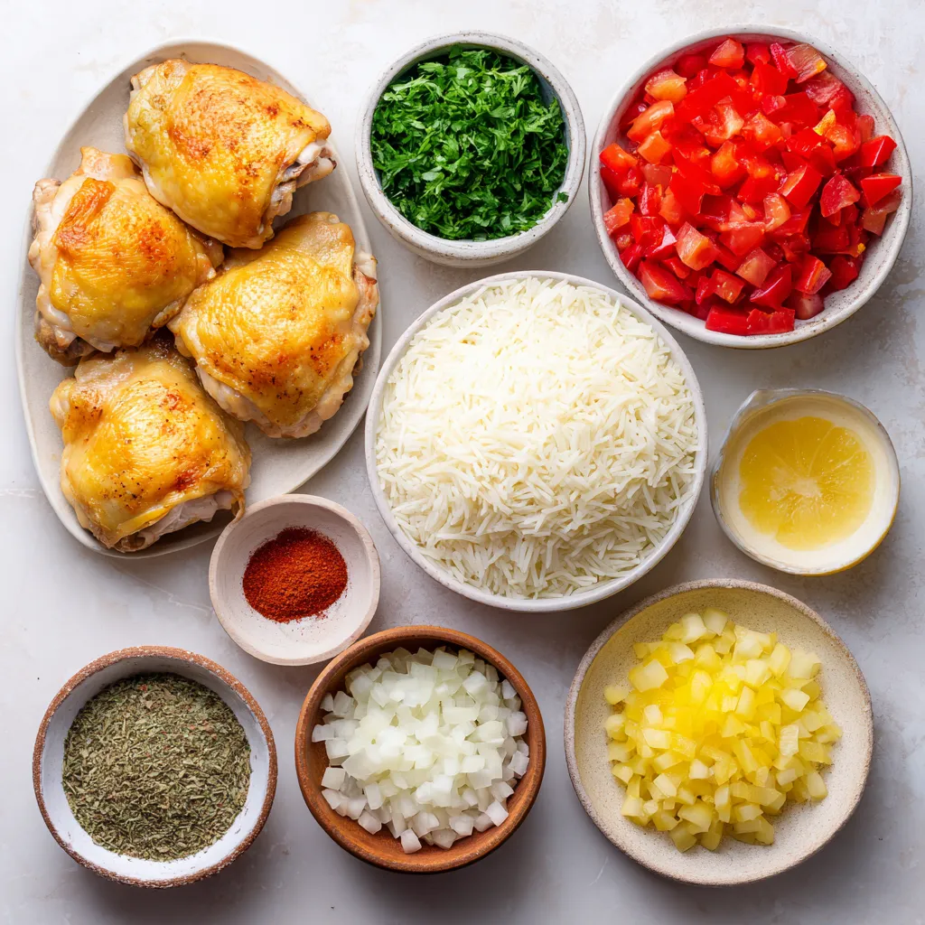 Die Hauptzutaten sind einfach zu finden. Hähnchenschenkel geben viel Geschmack. Langkornreis macht das Gericht schön sättigend. Die Paprika und Zwiebel bringen Farbe und Süße. Die gehackten Tomaten fügen Frische hinzu. Knoblauch sorgt für einen tollen Duft.