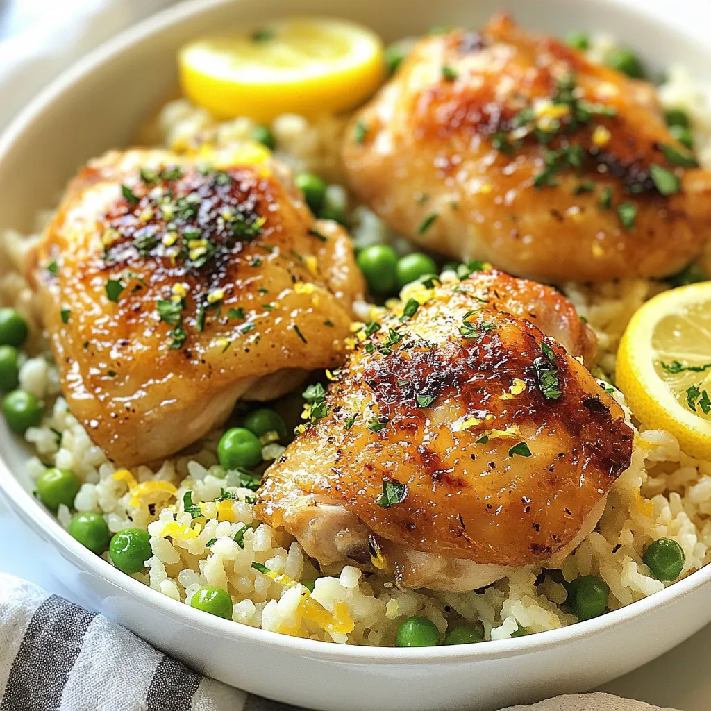 Für den nächsten Schritt geben Sie den Reis in den Topf. Fügen Sie auch die Zitronenschale und den Zitronensaft hinzu. Rühren Sie alles gut um und kochen Sie es eine weitere Minute. Das Rösten des Reises macht ihn aromatisch. Gießen Sie dann die Hühnerbrühe hinein. Mischen Sie alles gut. Legen Sie die Hähnchenschenkel wieder in den Topf. Decken Sie den Topf ab und bringen Sie alles zum Kochen. Reduzieren Sie dann die Hitze und lassen Sie alles 20 Minuten köcheln. Wenn Sie gefrorene Erbsen mögen, fügen Sie diese in den letzten fünf Minuten hinzu. Nach dem Kochen lassen Sie das Gericht fünf Minuten ruhen. Lockern Sie den Reis mit einer Gabel auf und garnieren Sie mit frischer Petersilie.