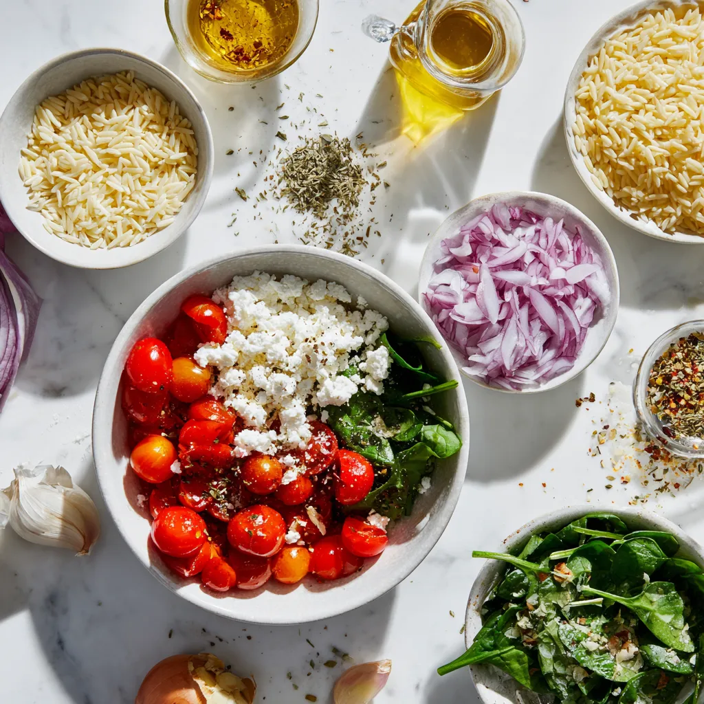 Diese Zutaten sind wichtig für den Geschmack. Das Hähnchen gibt dir Protein, die Orzo-Nudeln machen das Gericht sättigend. Kirschtomaten bringen Süße und Frische rein. Spinat fügt Farbe und Nährstoffe hinzu.