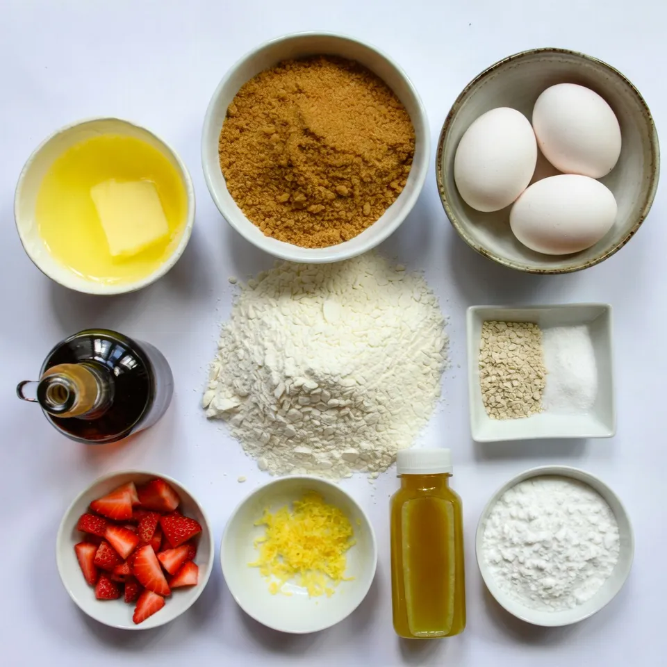 Die zusätzlichen Zutaten bringen Frische in die Blondies. Frische Erdbeeren sorgen für einen fruchtigen Biss. Zitronensaft und Zitronenschale verleihen einen spritzigen Geschmack. Die Eier binden alles zusammen und geben Feuchtigkeit. Vanilleextrakt rundet das Aroma ab. Schließlich bestäuben wir die Blondies mit Puderzucker für die süße Note.