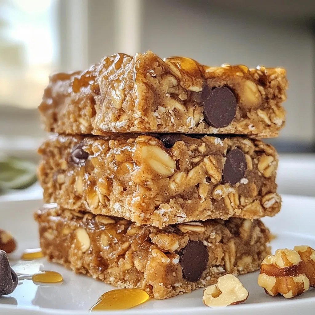 Servieren Sie die Riegel übereinander gestapelt auf einem rustikalen Holzbrett, verziert mit einem Honigträufel oder einem Hauch von Meersalz für eine ansprechende Präsentation.