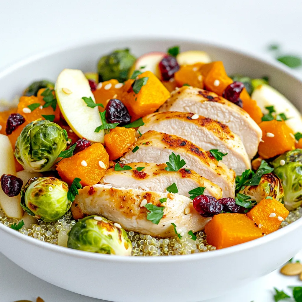 Diese Zutaten machen die Schalen nahrhaft und lecker. Die Hähnchenbrust bringt Protein. Quinoa ist eine tolle Quelle für Ballaststoffe. Butternusskürbis und Rosenkohl fügen Vitamine hinzu. Der Apfel sorgt für Süße, während die Cranberries und Kürbiskerne Knusprigkeit bringen.