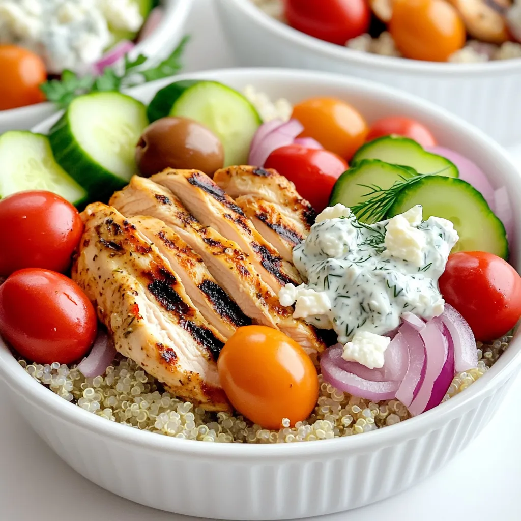 Nehmen Sie jede Schüssel und geben Sie eine Basis aus gekochter Quinoa oder Reis. Legen Sie die geschnittenen Hähnchenstreifen darauf und garnieren Sie mit Kirschtomaten, gewürfelter Gurke, roten Zwiebeln und Kalamata-Oliven. Diese frischen Zutaten bringen Farbe und Geschmack.