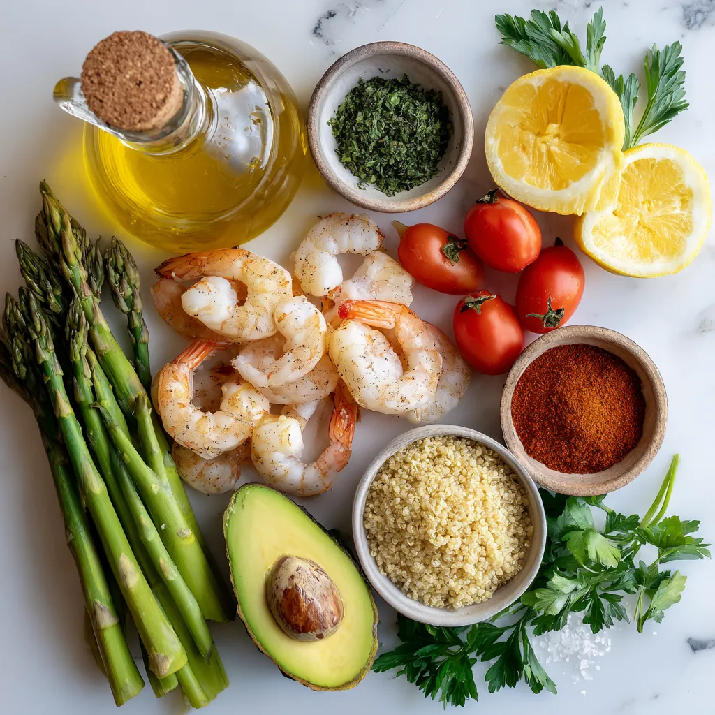 Eine köstliche und gesunde Schüssel mit gegrillten Garnelen, Spargel und frischen Zutaten.