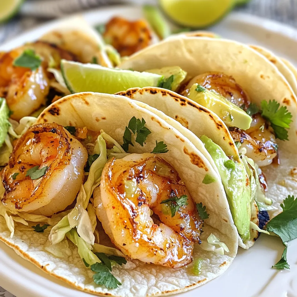 Leckere Tacos mit marinierten Garnelen, Limette und frischem Gemüse.