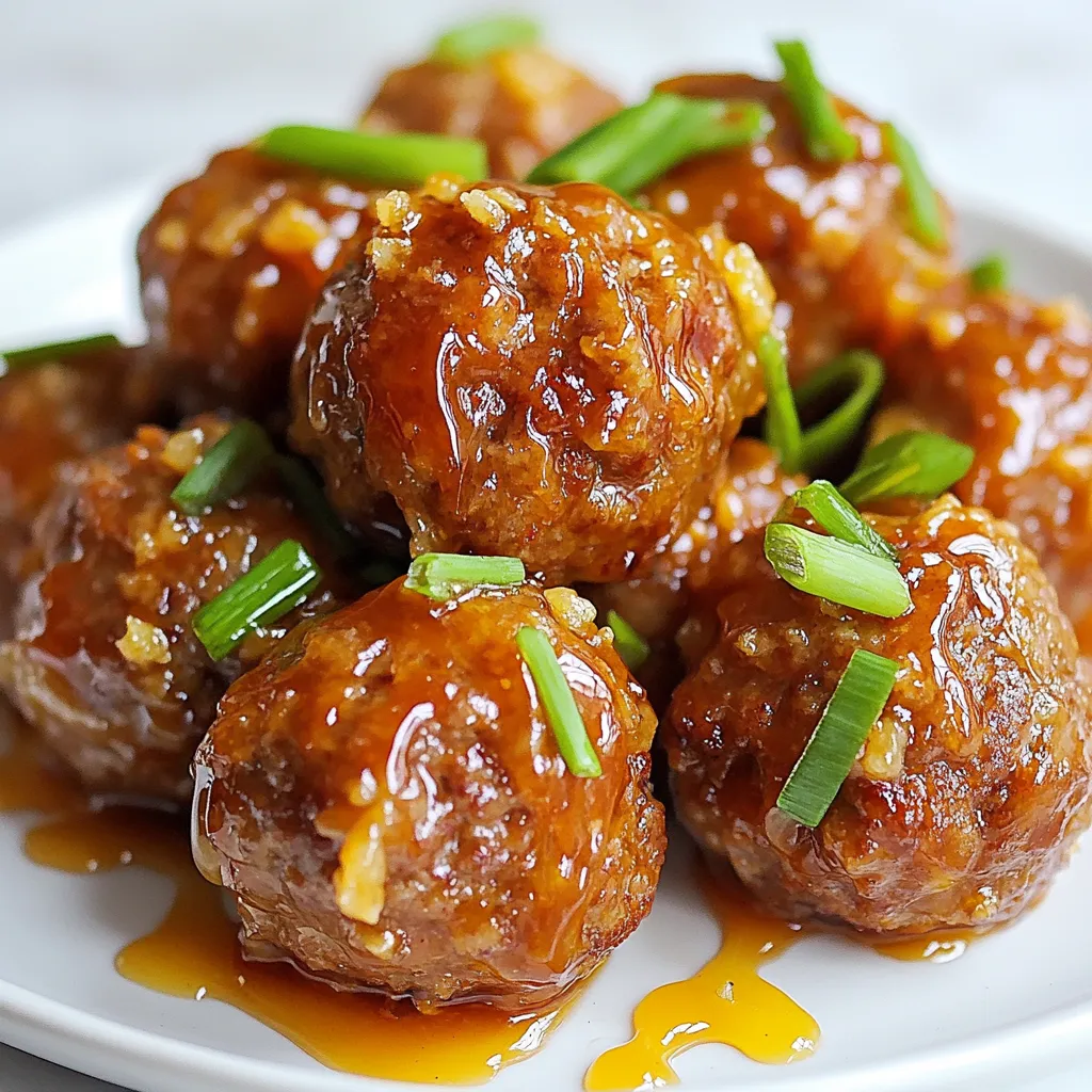 Übertragen Sie die Fleischbällchen auf einen Servierteller, beträufeln Sie sie mit der restlichen Glasur und garnieren Sie sie mit zusätzlichen gehackten Frühlingszwiebeln.