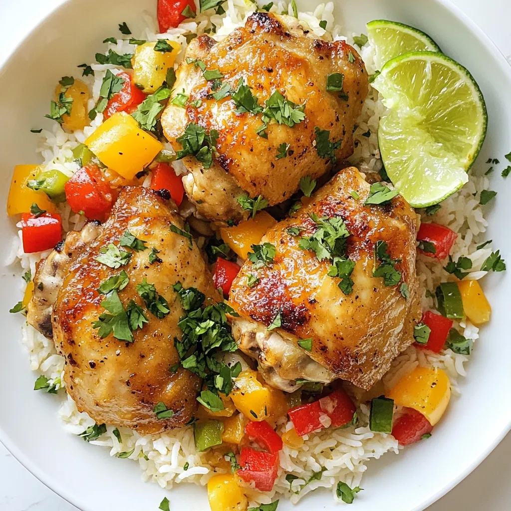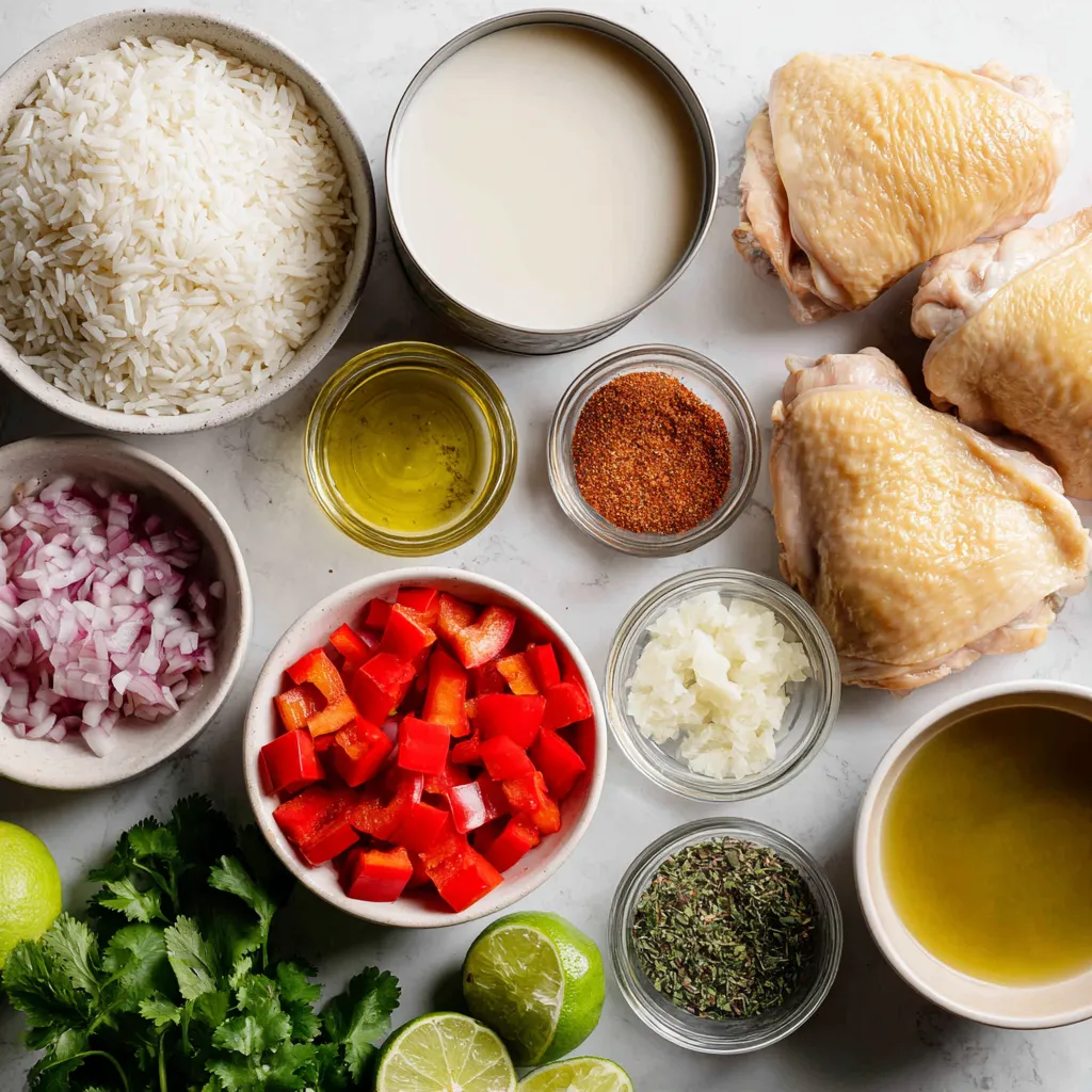 Ein köstliches und aromatisches Gericht mit Hähnchenschenkeln, Jasminreis und einer cremigen Kokosmilchsoße, perfekt für ein karibisches Flair.