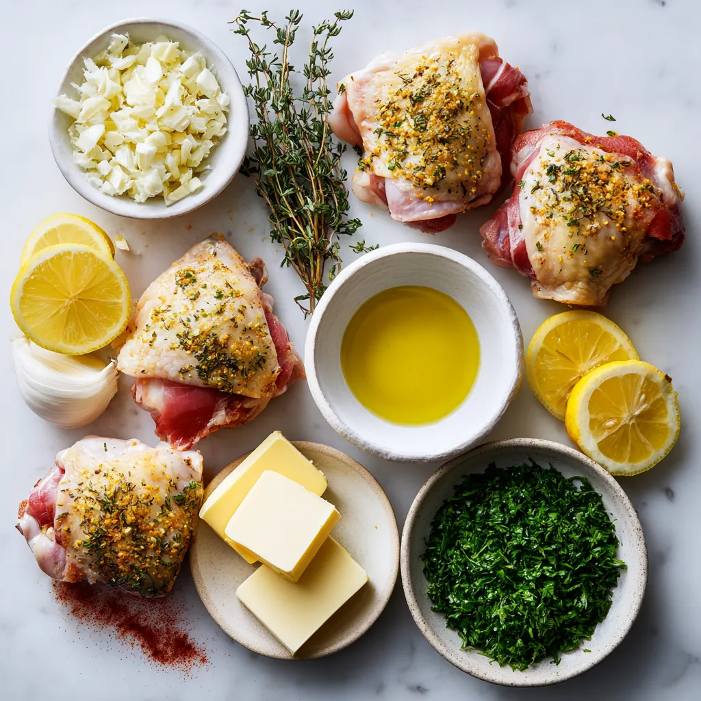 Diese Zutaten sind wichtig, um den vollen Geschmack zu erreichen. Die Hühnchenschenkel sorgen für Saftigkeit, während die Butter und der Knoblauch das Gericht reichhaltig machen.