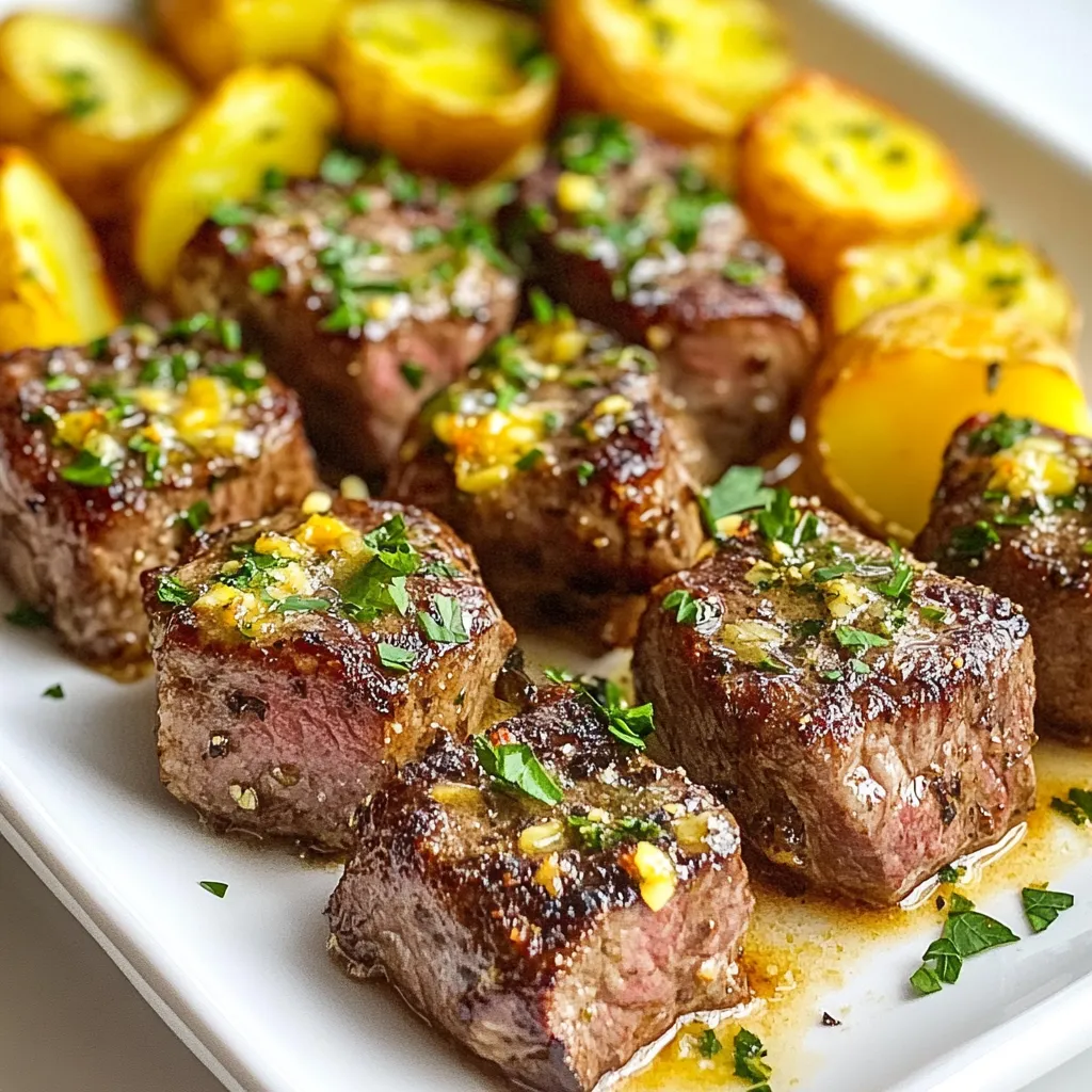 Ein köstliches Gericht mit zartem Rinderfilet und knusprigen Kartoffeln, verfeinert mit aromatischer Knoblauchbutter.