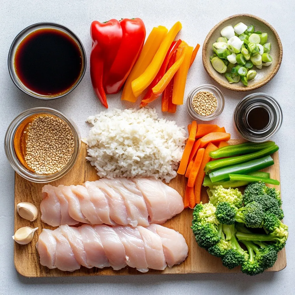 Die Hauptzutaten für die Korean Gochujang Chicken Bowls sind einfach. Ich beginne mit zwei Hähnchenbrustfilets. Diese sind mager und leicht zuzubereiten. Du schneidest sie in Scheiben, so dass sie schnell gar werden.