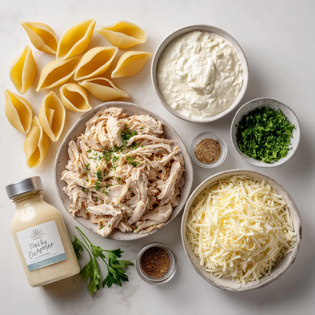 Hauptzutaten für Käse-Hähnchen-Alfredo gefüllte Muscheln