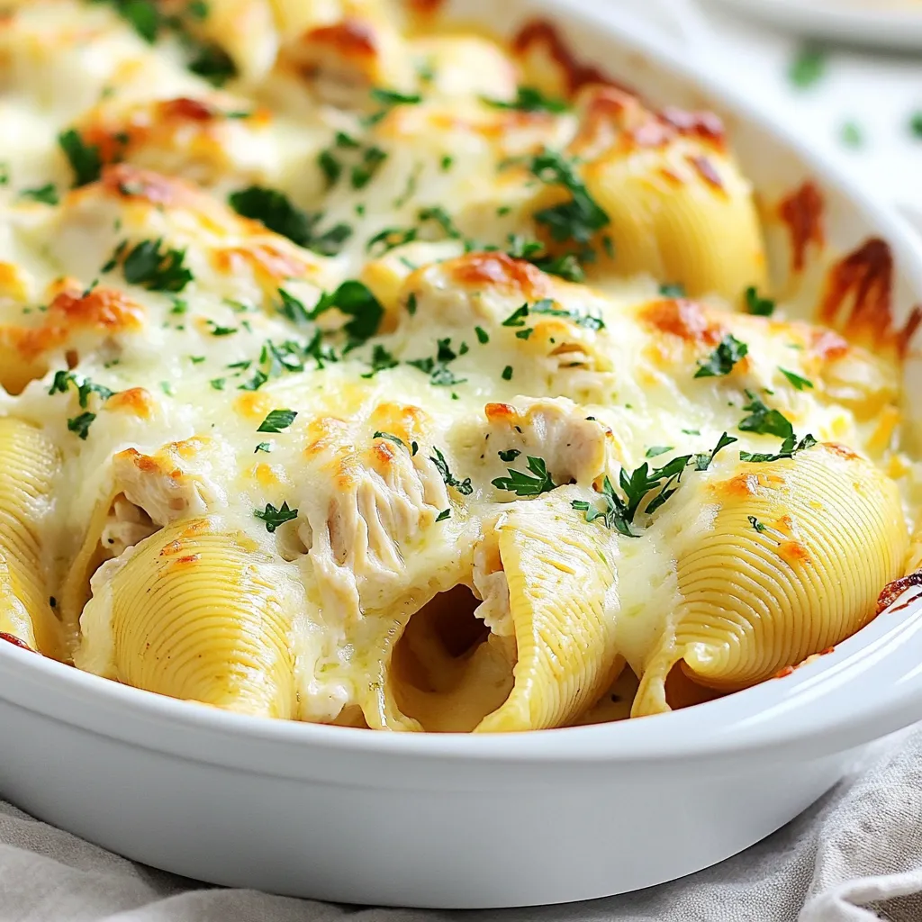Ein köstliches Gericht mit gefüllten Pasta-Muscheln, Hähnchen und einer cremigen Alfredo-Soße.