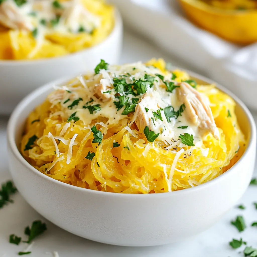 Ein köstliches und gesundes Gericht aus Spaghetti-Kürbis, zerkleinerter Hühnerbrust und einer cremigen Alfredo-Soße.