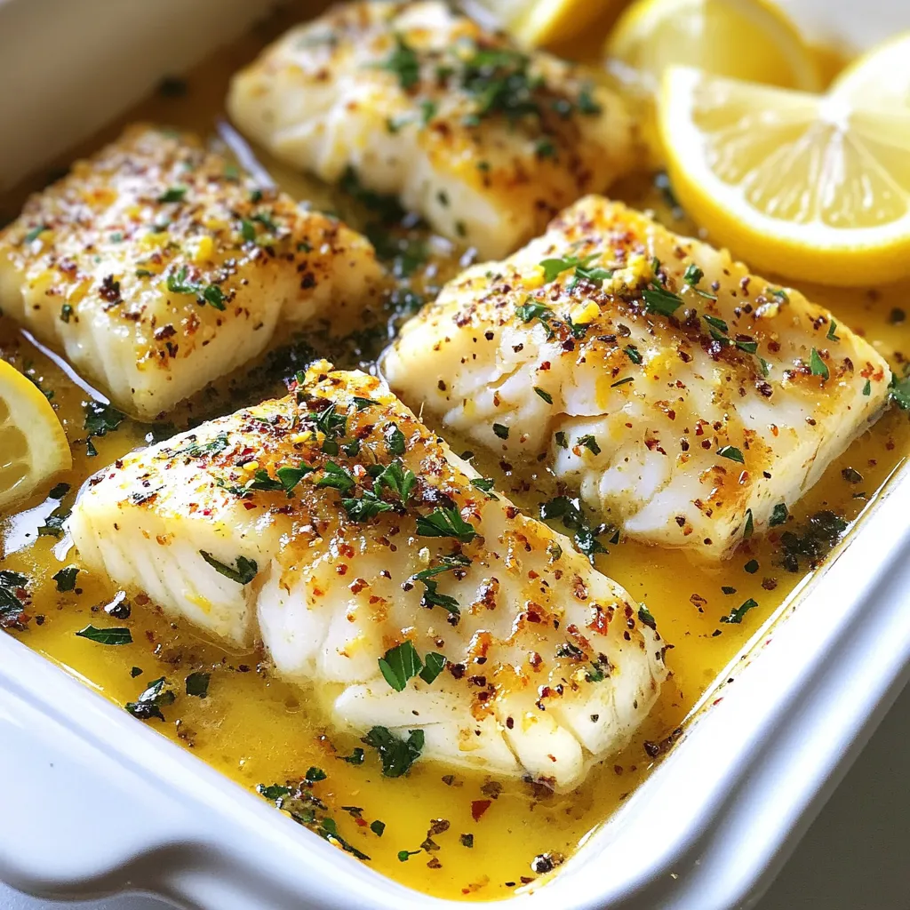 Gießen Sie die Zitronen-Knoblauch-Butter-Mischung gleichmäßig über die Kabeljaufilets, sodass jedes Filet großzügig bedeckt ist.