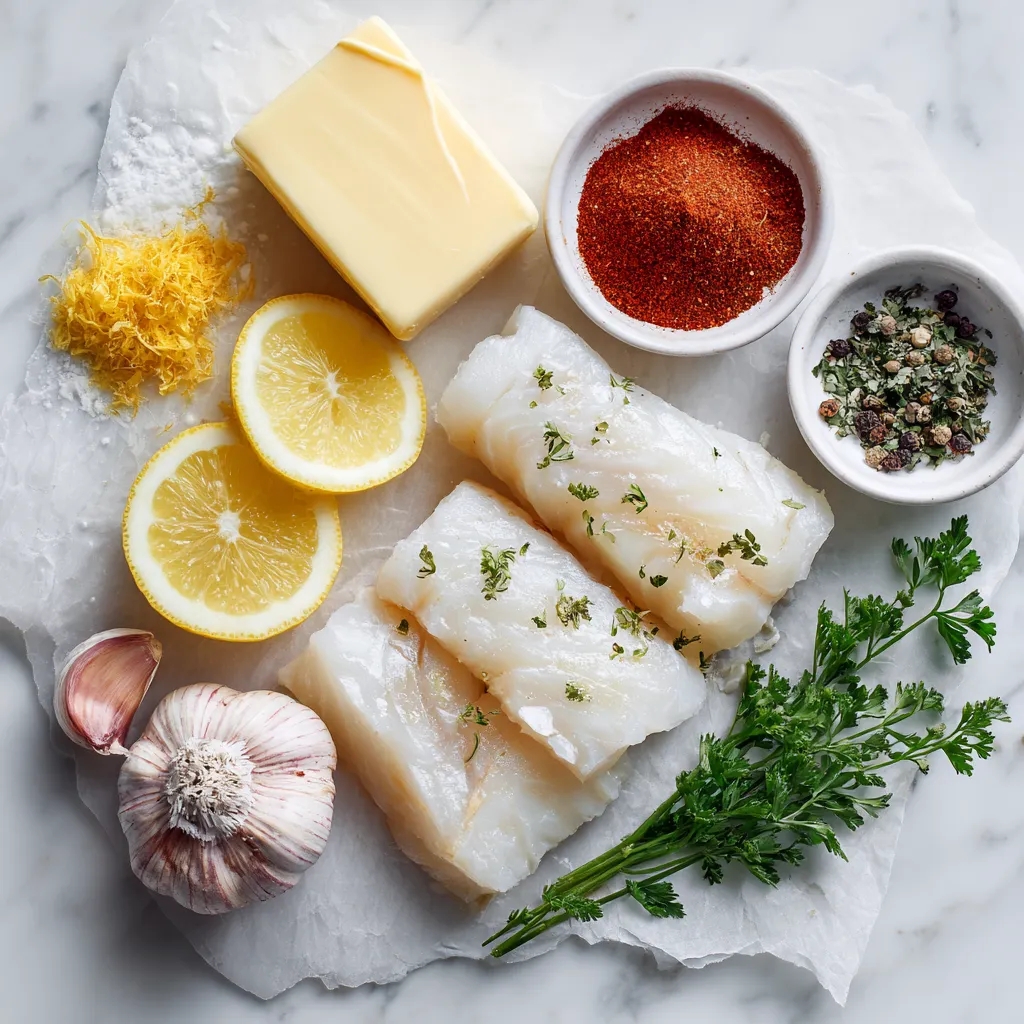 Die Hauptzutaten sind einfach und frisch. Kabeljau ist ein zarter Fisch, der gut zu vielen Aromen passt. Ungesalzene Butter gibt dem Gericht reichhaltigen Geschmack. Der gehackte Knoblauch bringt ein tolles Aroma. Ich achte immer darauf, frische Zutaten zu verwenden, um den besten Geschmack zu erzielen.