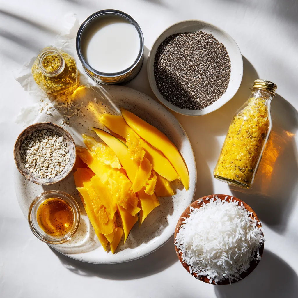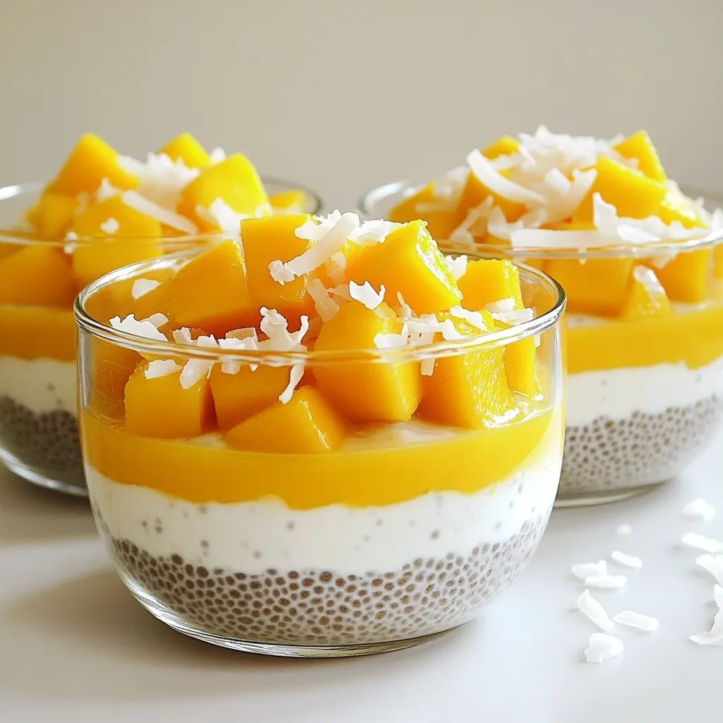 Ein erfrischender und gesunder Pudding mit Mango, Kokosnuss und Chiasamen.
