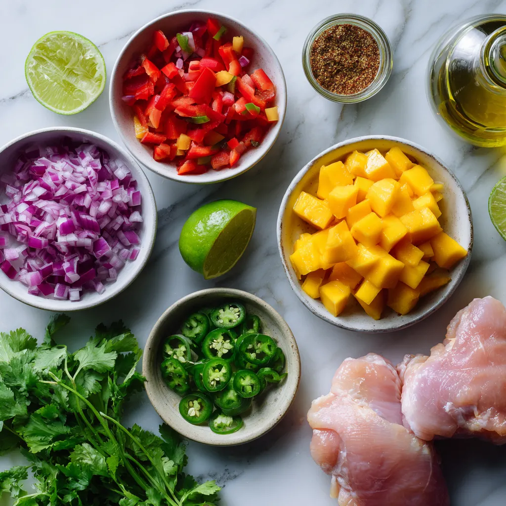 Die wichtigsten Zutaten sind Hähnchen und Mangos. Das Hähnchen gibt das Protein und die Mangos bringen Süße. Außerdem brauchen wir Zwiebeln für den Geschmack und Paprika für Farbe. Jalapeños fügen Schärfe hinzu. Koriander bringt Frische und Limettensaft sorgt für Säure. Kreuzkümmel rundet das Gericht ab. Diese Zutaten machen das Gericht zu einem Genuss.