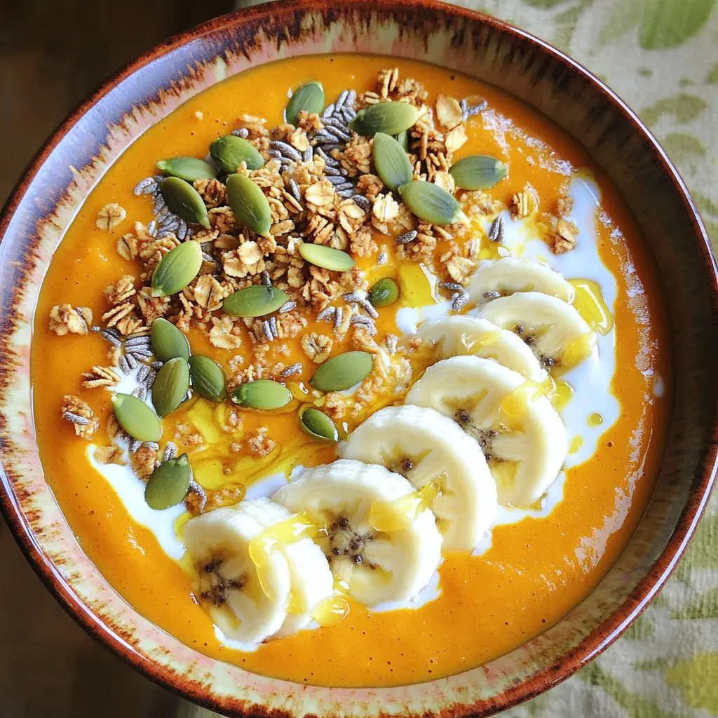 Um die perfekte Smoothie-Bowl zu machen, wähle frische und reife Zutaten. Ich empfehle, passierten Kürbis und gefrorene Bananen zu verwenden. Diese Zutaten sorgen für eine cremige Textur und den besten Geschmack. Mixe alles gut, bis keine Klumpen mehr da sind. Wenn es zu dick ist, füge mehr Mandelmilch hinzu. Gieße den Smoothie vorsichtig in eine Schüssel. Dekoriere die Oberfläche mit Granola, Bananenscheiben und Kürbiskernen. Ein Schuss Honig macht die Bowl noch besser.
