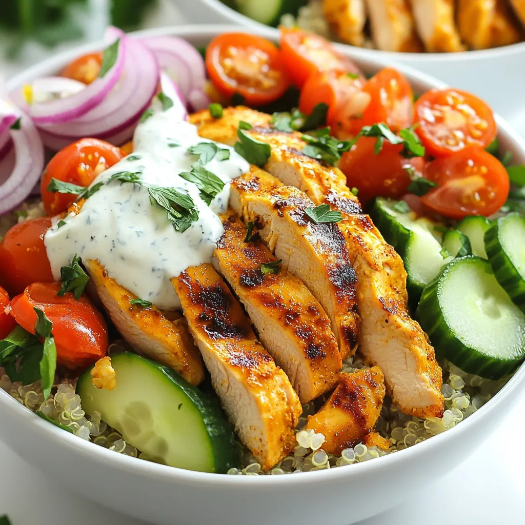 • Zum Anrichten der Schalen mit einer Portion Quinoa beginnen, gefolgt von einer großzügigen Menge des gebratenen Hähnchens. Anschließend die halbierten Kirschtomaten, gewürfelte Gurke, geschnittene rote Zwiebel und zerrupften Salat darüber geben. Die Joghurt-Tahini-Sauce großzügig darüber träufeln.