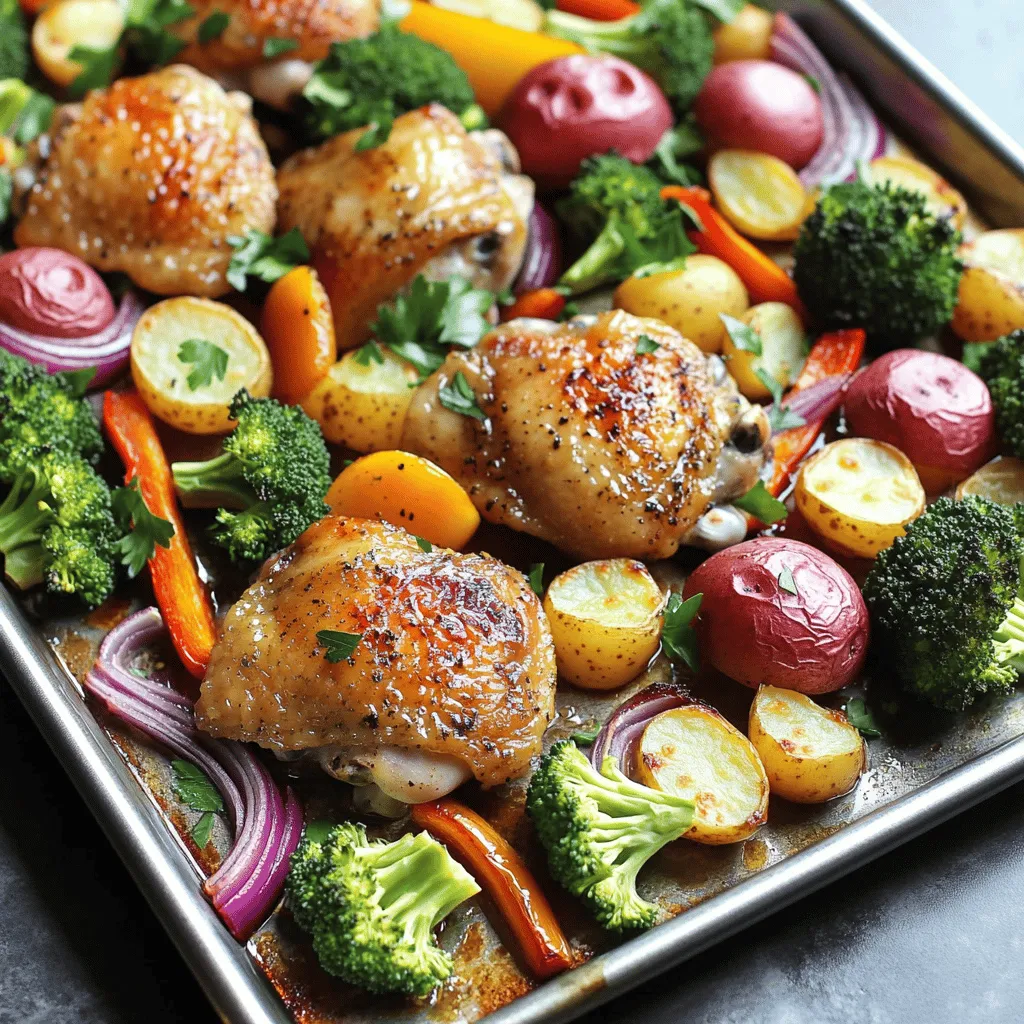 Für das Rezept brauchst du folgende Hauptzutaten: - 4 Hähnchenschenkel, entbeint und ohne Haut - 1 Tasse Babykartoffeln, halbiert - 2 Tassen Brokkoliröschen - 1 Paprika, in Streifen geschnitten (rot oder gelb) - 1 mittelgroße rote Zwiebel, in Spalten geschnitten - 4 Knoblauchzehen, fein gehackt Diese Zutaten machen das Gericht besonders lecker und nährstoffreich. Hähnchen ist eine gute Proteinquelle, während das Gemüse viele Vitamine liefert. Die perfekten Gewürze und Öle sind entscheidend für den Geschmack. Du benötigst: - 1 Päckchen Ranch-Gewürzmischung - 3 Esslöffel Olivenöl - Salz und Pfeffer nach Geschmack Die Ranch-Gewürzmischung bringt einen tollen, cremigen Geschmack. Das Olivenöl hilft, alles schön zu marinieren und gibt eine feine Note. Frische Kräuter machen jedes Gericht lebendig. Hier sind meine Empfehlungen: - Petersilie, gehackt (zum Garnieren) - Thymian oder Rosmarin für zusätzlichen Geschmack Frische Kräuter bringen Farbe und Frische auf deinen Teller. Sie passen super zu dem Hähnchen und dem Gemüse. Zuerst heize deinen Ofen auf 200 °C vor. Dies sorgt für eine gleichmäßige Garung. Lege ein großes Backblech mit Backpapier aus. Das macht die Reinigung einfacher. Jetzt schneide die Babykartoffeln in zwei Hälften. Teile den Brokkoli in kleine Röschen. Schneide die Paprika in Streifen und die Zwiebel in Spalten. So hast du alle Zutaten bereit. Diese Schritte helfen, alles schnell zu verarbeiten. Nehme eine kleine Schüssel und gebe das Olivenöl hinein. Füge die fein gehackten Knoblauchzehen dazu. Jetzt kommt die Ranch-Gewürzmischung. Diese Mischung gibt dem Hühnchen viel Geschmack. Gib eine Prise Salz und Pfeffer hinzu. Rühre alles gut um, bis eine gleichmäßige Marinade entsteht. Diese Marinade macht das Hühnchen zart und lecker. In einer anderen großen Schüssel gib die Babykartoffeln, Brokkoliröschen, Paprika und Zwiebel. Gieße die restliche Marinade darüber. Mische alles gut, bis das Gemüse gleichmäßig bedeckt ist. Dadurch wird jedes Stück Gemüse würzig und schmackhaft. Lass die Marinade kurz einziehen. So haben die Aromen Zeit, sich zu entfalten. Verteile das marinierte Gemüse gleichmäßig auf einer Seite des Backblechs. Platziere die marinierten Hähnchenschenkel auf die andere Seite. Achte darauf, dass sie genügend Platz haben. Jetzt backe alles im vorgeheizten Ofen für 25-30 Minuten. Das Hühnchen sollte eine Kerntemperatur von 74 °C erreichen. Das Gemüse wird zart und leicht karamellisiert. Am Ende nimm das Blech aus dem Ofen und lasse das Gericht einige Minuten ruhen. Garnieren mit frisch gehackter Petersilie bringt Farbe und Geschmack. Um das Hühnchen perfekt zu garen, stelle sicher, dass die Kerntemperatur 74 °C erreicht. Das Gemüse braucht nur 25-30 Minuten im Ofen. Achte darauf, dass die Babykartoffeln weich und das Brokkoli zart ist. Wenn du das Gemüse länger im Ofen lässt, kann es verbrennen. Du kannst die Garzeiten auch anpassen. Wenn du mehr Gemüse hast, erhöhe die Zeit leicht. Du kannst die Marinade leicht ändern. Zum Beispiel, füge Zitronensaft für einen frischen Geschmack hinzu. Oder mische verschiedene Kräuter wie Thymian oder Rosmarin. Für einen scharfen Kick, probiere etwas Chili oder Paprika. Wenn du keinen Ranch-Gewürzmischung hast, kannst du auch italienische Kräuter verwenden. Das gibt dir neue Aromen. Serviere dein Hühnchen und Gemüse mit Reis oder Quinoa für mehr Sättigung. Ein einfacher grüner Salat passt gut dazu. Du kannst auch Brot oder Knoblauchbrot auf die Seite stellen. Wenn du das Gericht rustikal präsentieren möchtest, serviere alles direkt vom Backblech. Für ein schickeres Aussehen, richte das Hühnchen und das Gemüse auf Tellern an. Vergiss nicht, die frisch gehackte Petersilie darüber zu streuen. {{image_4}} Sie können viele verschiedene Gemüsesorten verwenden. Brokkoli ist toll, aber versuchen Sie auch Zucchini oder grüne Bohnen. Karotten geben eine schöne Süße. Blumenkohl ist eine weitere schmackhafte Wahl. Die Vielfalt macht das Gericht lebendig und bunt. Achten Sie darauf, dass das Gemüse gleichmäßig kocht. Schneiden Sie es in ähnliche Größen. Hühnchen ist sehr beliebt, doch andere Proteine sind auch lecker. Probieren Sie Hähnchenbrust oder Putenbrust für eine magere Option. Schweinefleisch kann ebenfalls gut passen. Für Fischliebhaber sind Lachs oder Forelle eine feine Wahl. Sie können auch Tofu verwenden, um das Gericht noch proteinreicher zu machen. Marinieren Sie die Proteine wie das Hühnchen. Vegane und vegetarische Varianten sind einfach zuzubereiten. Ersetzen Sie das Hühnchen durch Kichererbsen oder Linsen. Diese liefern viel Protein und Ballaststoffe. Nutzen Sie auch Tempeh oder Seitan für eine fleischähnliche Textur. Statt Ranch-Gewürzmischung können Sie einen veganen Dip verwenden, um den Geschmack zu verbessern. Fügen Sie frische Kräuter für mehr Aroma hinzu. Um das Blech-Pfanne Knoblauch-Ranch-Hühnchen und Gemüse frisch zu halten, lege die Reste in einen luftdichten Behälter. So bleiben die Aromen erhalten. Lagere das Gericht im Kühlschrank und verbrauche es innerhalb von drei bis fünf Tagen. Vor dem Servieren kannst du das Gericht auf Zimmertemperatur bringen oder leicht aufwärmen. Wenn du Reste für später aufbewahren möchtest, kannst du das Gericht auch einfrieren. Teile es in Portionen und lege es in gefriergeeignete Behälter oder Beutel. Stelle sicher, dass du so viel Luft wie möglich entfernst, um Gefrierbrand zu vermeiden. Das Gericht bleibt bis zu drei Monate frisch. Zum Auftauen lasse es über Nacht im Kühlschrank oder erwärme es direkt aus dem Gefrierfach. Zum Aufwärmen empfehle ich, das Gericht im Ofen bei 180 °C für etwa 15-20 Minuten zu erhitzen. So bleibt das Hühnchen saftig und das Gemüse knusprig. Du kannst auch die Mikrowelle nutzen, aber achte darauf, die Portionen gleichmäßig zu verteilen, damit alles gut erhitzt wird. Füge etwas Olivenöl oder Brühe hinzu, um die Feuchtigkei