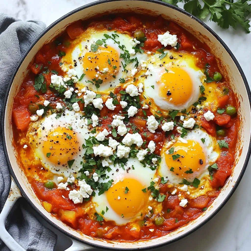 Ein köstliches Gericht mit Eiern in einer würzigen Tomatensauce, garniert mit Feta-Käse.