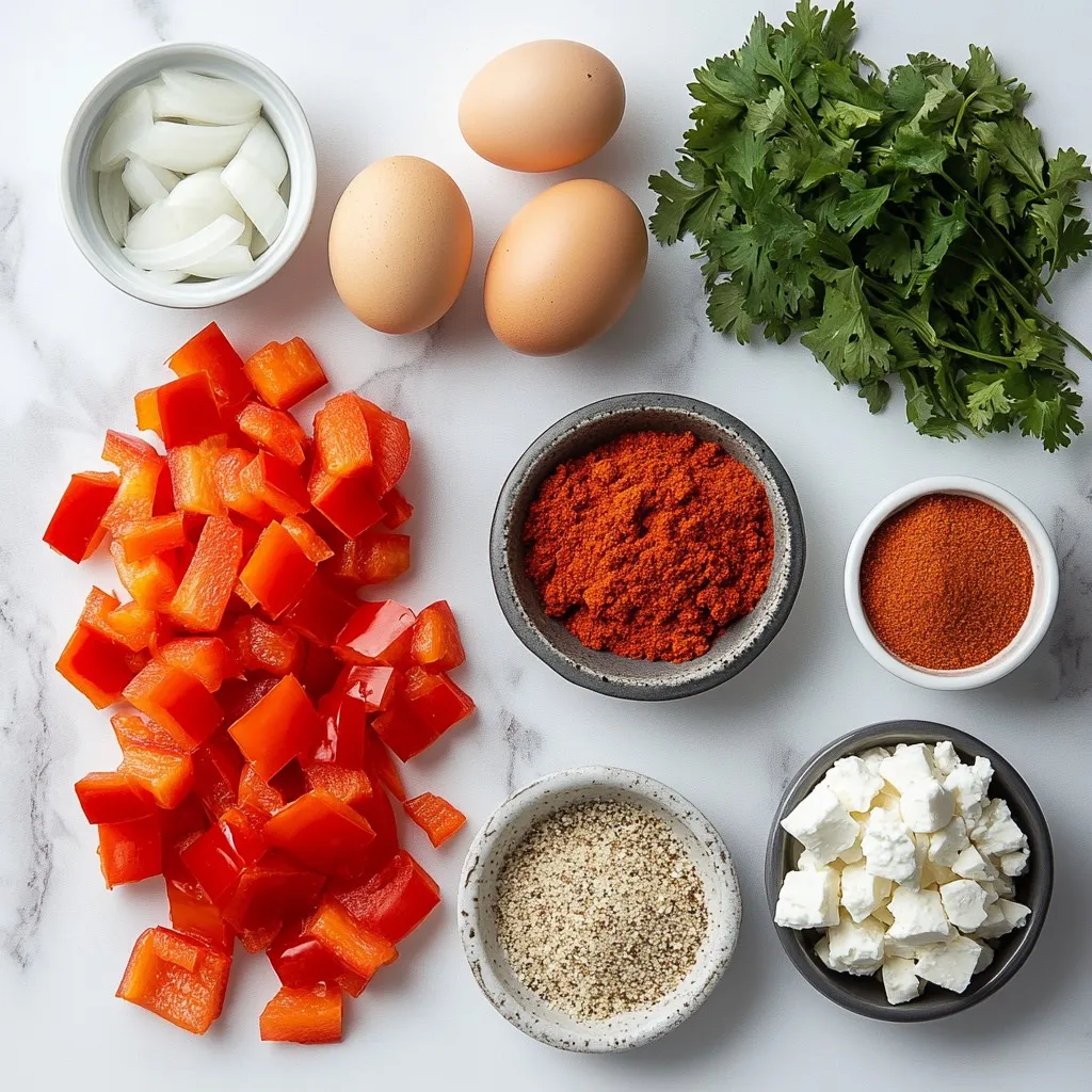 Shakshuka mit Feta hat viele schmackhafte Zutaten. Jedes Element bringt seinen eigenen Geschmack mit.