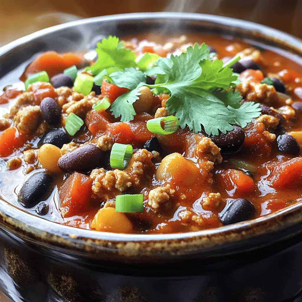 - Gemahlenes Truthahnfleisch: Dieses Fleisch macht das Chili leicht und gesund. Ich benutze 450 g. Es sorgt für eine schöne Textur. - Bohnen und Tomaten: Ich füge eine Dose schwarze Bohnen und eine Dose Kidneybohnen hinzu. Beide Bohnen sind gut für den Proteinbedarf. Eine Dose gewürfelte Tomaten mit grünen Chilis bringt Geschmack und Farbe. - Gewürze und Aromen: Gewürze bringen das Chili zum Leben. Ich benutze 2 Esslöffel Chilipulver, 1 Esslöffel Kreuzkümmel und 1 Esslöffel geräuchertes Paprikapulver. Cayennepfeffer passt gut dazu, aber nur nach Geschmack. Brauner Zucker rundet die Schärfe ab. Ich füge auch Salz und Pfeffer hinzu, um den Geschmack zu verbessern. Zusätzlich benötige ich Zwiebeln, Knoblauch, Paprika und Mais. Diese Zutaten sorgen für mehr Textur und Geschmack. Frischer Koriander oder Frühlingszwiebeln sind eine schöne Garnierung. 1. Erhitze in einer Pfanne 1 Esslöffel Olivenöl bei mittlerer Hitze. 2. Füge die gehackte Zwiebel, den Knoblauch und die gewürfelte Paprika hinzu. 3. Brate das Gemüse für etwa 5 Minuten, bis es weich und duftend ist. 4. Gib das gemahlene Truthahnfleisch in die Pfanne. 5. Brate es an, bis es gleichmäßig braun ist. 6. Teile das Fleisch mit einem Spatel in kleine Stücke. 7. Entferne überschüssiges Fett aus der Pfanne, falls nötig. 1. Übertrage die Truthahn-Mischung in den Slow Cooker. 2. Füge die schwarzen Bohnen, Kidneybohnen und gewürfelte Tomaten hinzu. 3. Gib den gefrorenen oder abgetropften Mais dazu. 4. Mische Chilipulver, Kreuzkümmel, geräuchertes Paprikapulver, Cayennepfeffer, braunen Zucker, Salz und Pfeffer hinein. 5. Rühre alle Zutaten gut um, bis sie gleichmäßig verteilt sind. 1. Decke den Slow Cooker ab. Stelle ihn auf niedrige Temperatur für 6 Stunden oder hohe Temperatur für 3 Stunden. 2. Nach dem Kochen probiere das Chili. 3. Passe die Würze nach deinem Geschmack an. 4. Wenn du ein dickflüssigeres Chili magst, koche es unbedeckt auf hoher Stufe für 30 Minuten weiter. 5. Serviere das Chili heiß. Garniere es mit frischem Koriander oder Frühlingszwiebeln, wenn du magst. Um das Beste aus deinem Chili herauszuholen, passe die Gewürze an. Du kannst mehr Chilipulver oder Cayennepfeffer hinzufügen, wenn du es schärfer magst. Für eine süßere Note, erhöhe den braunen Zucker. Experimentiere mit Gewürzen wie Oregano oder Thymian für neue Geschmäcker. Füge andere Zutaten hinzu, um neue Texturen und Aromen zu schaffen. Probiere Mais oder Zucchini. Auch frische Kräuter wie Koriander bringen Frische ins Gericht. Sei kreativ und mache das Chili zu deinem eigenen! Die Zubereitung ist einfach und schnell. Du benötigst nur 15 Minuten, um alles vorzubereiten. Nach dem Anbraten des Gemüses und der Truthahnmasse, kannst du alles in den Slow Cooker geben. Die Kochzeit beträgt entweder 6 Stunden auf niedriger oder 3 Stunden auf hoher Stufe. Wenn du wenig Zeit hast, kannst du das Chili auch am Vortag zubereiten. Lass es einfach im Kühlschrank abkühlen und erwärme es am nächsten Tag. Das Chili sieht toll aus in tiefen Schalen. Du kannst es mit frischem Koriander oder Frühlingszwiebeln garnieren. Ein Spritzer Limettensaft gibt einen frischen Kick. Serviere das Chili mit Reis, Tortilla Chips oder einem Stück Brot. Diese Beilagen ergänzen das Gericht perfekt und machen es noch leckerer! {{image_4}} Wenn du eine pflanzenbasierte Option möchtest, probiere diese Zutaten. Statt Truthahnfleisch kannst du Linsen oder schwarze Bohnen verwenden. Diese bieten viel Protein und einen tollen Geschmack. Tofu ist auch eine gute Wahl, wenn du eine andere Textur magst. Achte darauf, die Gewürze gut anzupassen. So bekommst du das perfekte Aroma. Die Gewürze machen den Unterschied in deinem Chili. Du kannst mit der Schärfe spielen. Wenn du es schärfer magst, füge mehr Cayennepfeffer hinzu. Für weniger Schärfe, reduziere die Menge. Experimentiere auch mit anderen Gewürzen, wie Oregano oder Zimt. Sie geben deinem Chili einen neuen Twist und viel Tiefe. Nutze lokale Zutaten, um frische Aromen zu erhalten. Bunte Paprika sind nicht nur lecker, sondern auch schön anzusehen. Du kannst gelbe, grüne oder rote Paprika verwenden. Sie bringen Farbe und Süße in dein Gericht. Denke auch an saisonale Produkte, um das Beste aus deinem Chili herauszuholen. Ich empfehle, das Chili in einem luftdichten Behälter zu lagern. So bleibt es frisch. Im Kühlschrank hält sich das Chili bis zu 4 Tage. Achten Sie darauf, dass der Behälter gut verschlossen ist. So vermeiden Sie Gerüche von anderen Lebensmitteln. Das Chili lässt sich hervorragend einfrieren. Verwenden Sie gefriergeeignete Behälter oder Beutel. Achten Sie darauf, etwas Platz für die Ausdehnung zu lassen. So bleibt die Konsistenz gut. Zum Auftauen legen Sie es einfach über Nacht in den Kühlschrank. Alternativ können Sie es auch in der Mikrowelle auftauen. Um das Chili wieder warm zu machen, haben Sie zwei gute Optionen: die Mikrowelle oder den Herd. In der Mikrowelle erwärmen Sie es in einem geeigneten Behälter. Stellen Sie die Leistung auf mittlere Stufe und rühren Sie zwischendurch um. Auf dem Herd erhitzen Sie das Chili in einer Pfanne bei mittlerer Hitze. Rühren Sie oft, damit es gleichmäßig warm wird. Um das Chili schärfer zu machen, füge einfach mehr Cayennepfeffer hinzu. Du kannst auch frische Chilis verwenden, wie Jalapeños oder Serranos. Diese geben nicht nur Schärfe, sondern auch tollen Geschmack. Denke daran, die Menge langsam zu erhöhen. So kannst du die Schärfe gut kontrollieren. Ja, du kannst andere Fleischsorten verwenden. Rinderhack oder Hähnchen sind gute Alternativen. Für eine leichtere Option wähle Pute oder Hähnchenbrust. Wenn du es vegetarisch magst, ersetze das Fleisch durch Linsen oder Tofu. Diese Optionen machen das Gericht gesund und lecker. Zu diesem Chili passen viele Beilagen gut. Einige meiner Favoriten sind: - Maisbrot - Reis - Tortilla-Chips - Guacamole - Frischer Salat Diese Beilagen machen dein Chili noch bes