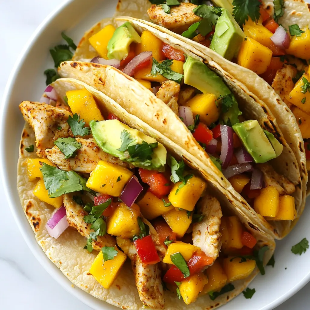 Leckere Tacos mit würzigem Hähnchen und frischer Mango.