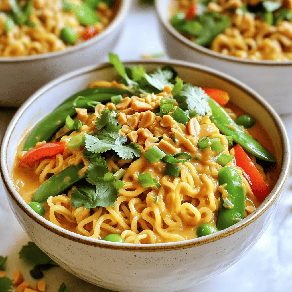 Portioniere die würzigen Erdnussbutter Ramen in Schüsseln. Garniere jede Portion mit gehackten Frühlingszwiebeln, zerdrückten Erdnüssen und frischem Koriander. Diese Garnituren geben Farbe und zusätzlichen Geschmack.