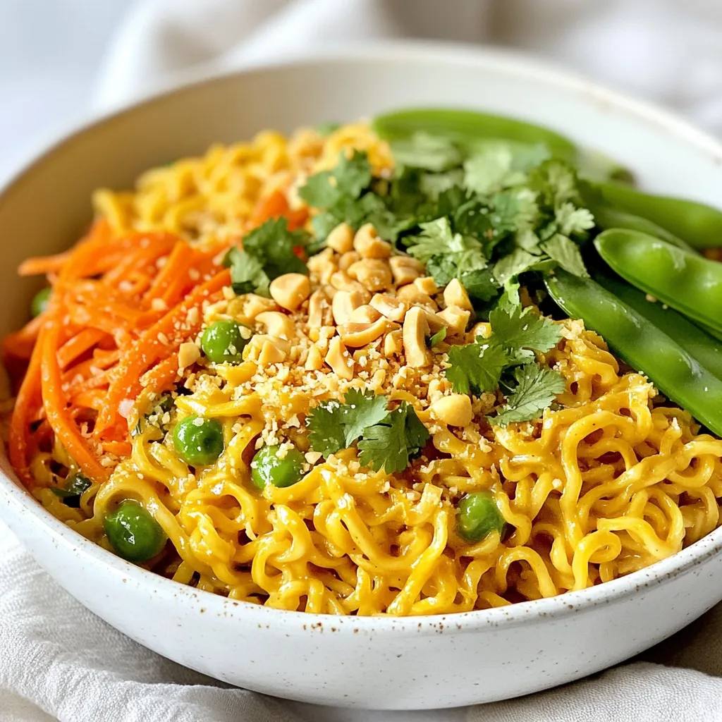 Servieren Sie die würzigen Erdnuss-Ramen in Schalen, dekoriert mit den geschnittenen Frühlingszwiebeln, gehacktem Koriander und zerdrückten Erdnüssen für zusätzlichen Crunch.