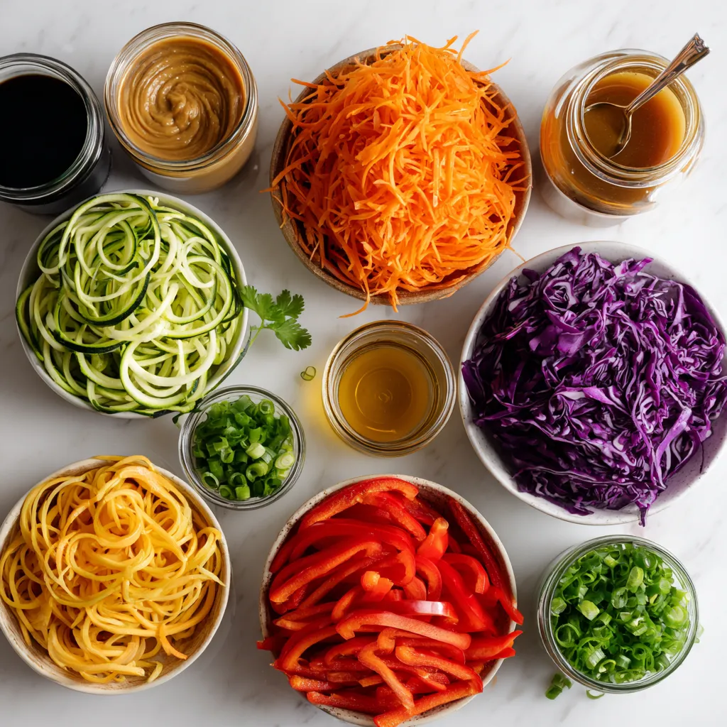 Diese Zutaten bringen Farbe und Crunch in den Salat. Die Zucchini sind leicht und gesund. Karotten fügen Süße hinzu, während die Paprika und der Kohl für Knackigkeit sorgen. Koriander und Frühlingszwiebeln geben frische Aromen.