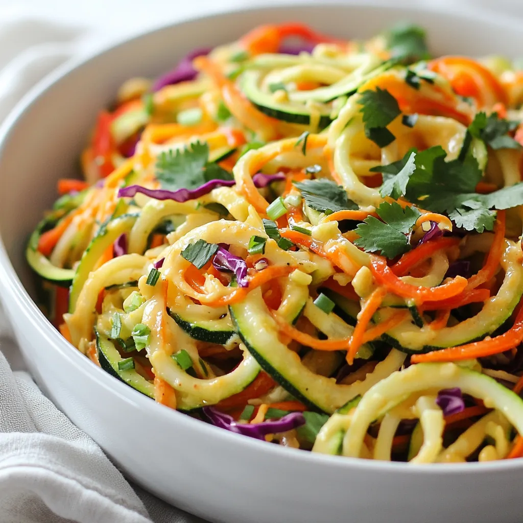 Ein erfrischender Salat mit spiralisierten Zucchini und einem würzigen Erdnuss-Dressing.